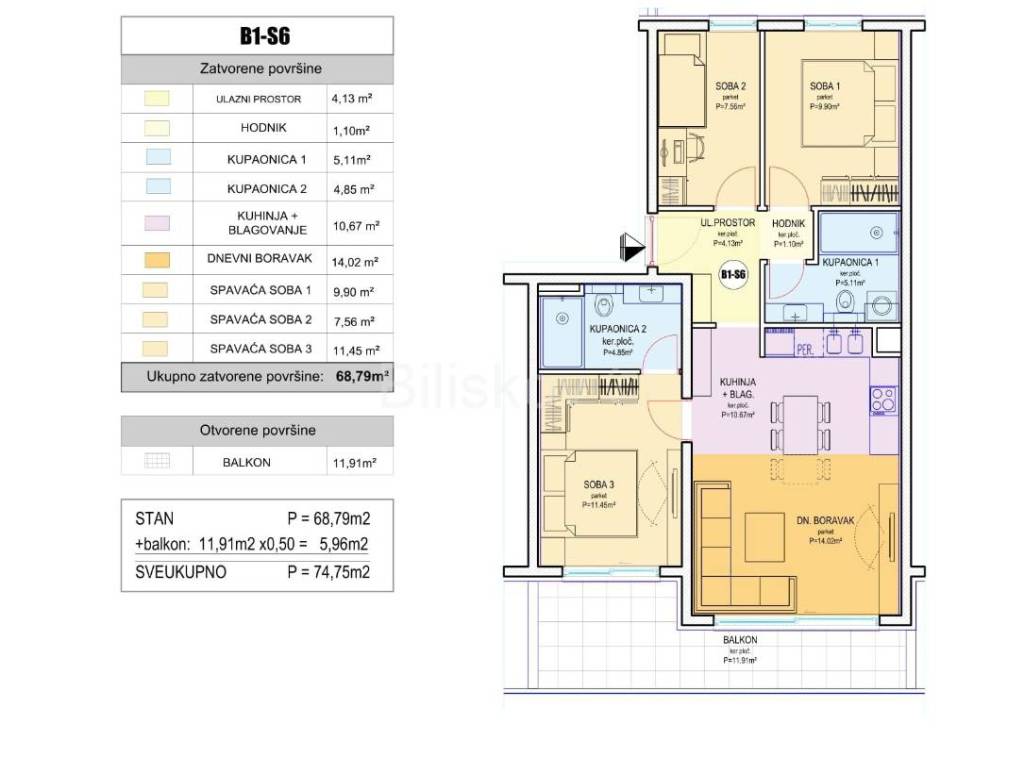 Split, Duilovo, for sale, apartments, new building, 3 buildingsWe are brokering the sale of apartments in 3 buildings that represent one complex. Secure a new building at a more favorable price than most old buildings!!Construction will begin by summer 2026, and the construction deadline is 30 months from the start of work.Payment schedule:30% upon signing the preliminary contract40% upon completion of the concrete structure30% upon completion of the facadeAll 3 buildings are connected by an elevator from two basement floors with parking spaces and storage rooms.The price of parking spaces in the closed basement is 2,000/m2, outdoor parking spaces 1,800/m2, and storage rooms 2,200/m2.Building B has 2 entrances with elevator, consists of a basement, ground floor and 3 floors, and offers the following apartments:B1-S1 3-bedroom southwest-north 97.98m2, 4,650/m2 455,607B1-S2 3-bedroom south-north 78.94m2, 4,800/m2 378,912B1-S3 3-bedroom southwest-north 100.94m2 4,850/m2 489,559B1-S4 3-bedroom south-north 74.81m2, 4,950/m2 370,309.50B1-S5 3-bedroom southwest-north 93.98m2, 5,100/m2 479,298B1-S6 3-bedroom southwest-north 74.75m2, 5,100/m2 381,225B1-S7 3-bedroom southwest-north 93.98m2, 5,500/m2 516,890