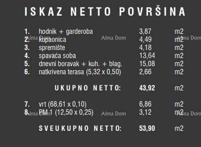 We are selling an apartment in a new residential complex in Štinjan. The complex consists of 19 two-story residential buildings. The location of the new residential complex is excellent, just a kilometer away from the center of Štinjan and in the immediate vicinity of the elementary school, kindergarten, Hidrobaza city beach, pharmacy, and only four kilometers from the center of Pula and three kilometers from the center of Fažana.Access to the residential complex is provided from an asphalt surface, within which all the necessary infrastructure will be located (electricity, water, sewage).Apartment marked 9A is located on the ground floor of the building and consists of: hallway, living room with kitchen and dining area, bedroom, bathroom, storage room and terrace.What makes this project special is the architectural design of the facade of the residential buildings, and the green roofs that appear on the facade.Each residential unit is provided with the required number of parking spaces according to the urban plan of the city of Pula, dimensions 2.50m" x 5.00m". Each parking space is designed to have a future connection to the electricity grid with the aim of connecting chargers for electric vehicles.This apartment has a garden, 1 parking space, included in the price.We accept reservations!For additional information, please contact:Azra+385 91 611 5706+385 98 420 885azra@almadominvest.com