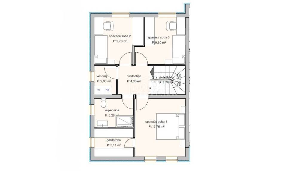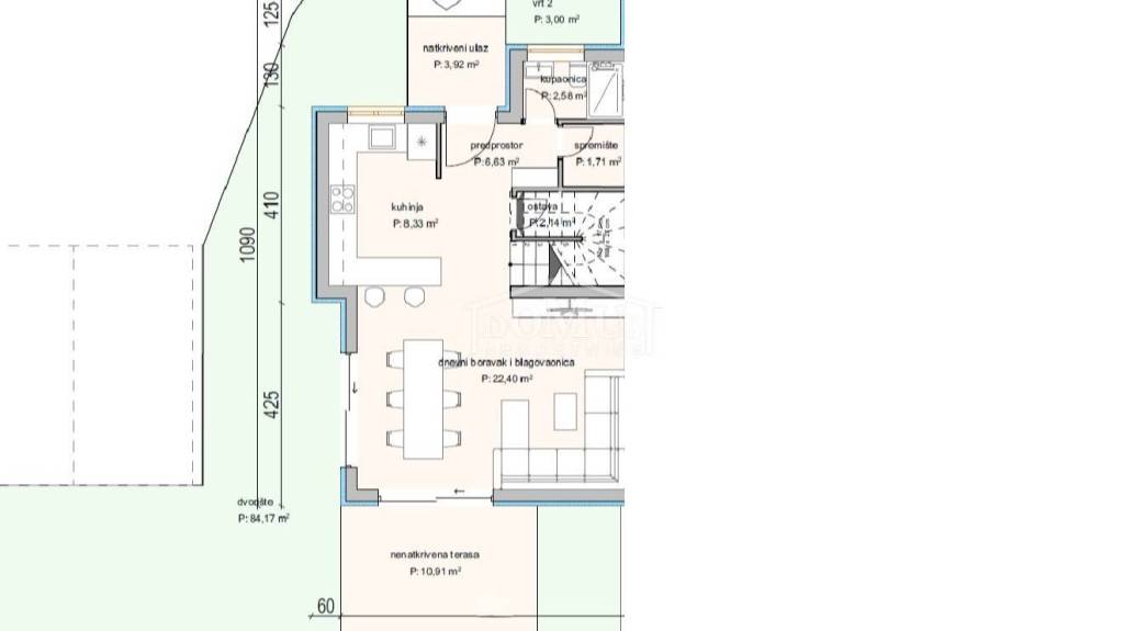 The house S1 is part of a semi-detached (three-unit) building, spread over two floors (ground floor + first floor), with a total usable living area of 118.01 m², a garden of 84.17 m², and two parking spaces. The ground floor consists of a spacious living room with kitchen and dining area, with direct access to a 10.91 m² terrace, a bathroom, and a storage room. Internal stairs lead to the first floor, where there is a hallway, a bathroom, a laundry room, and three bedrooms, one of which has its own walk-in wardrobe. The house will be equipped with security entrance doors, PVC windows with mosquito screens and electric shutters, high-quality ceramic flooring, underfloor heating in all bathrooms, and air-conditioning units in the living room and all bedrooms.
