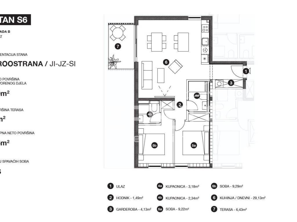 Located on the second floor, it consists of two bedrooms, a living room with a kitchen, two bathrooms, a hallway with a wardrobe, and a covered terrace.