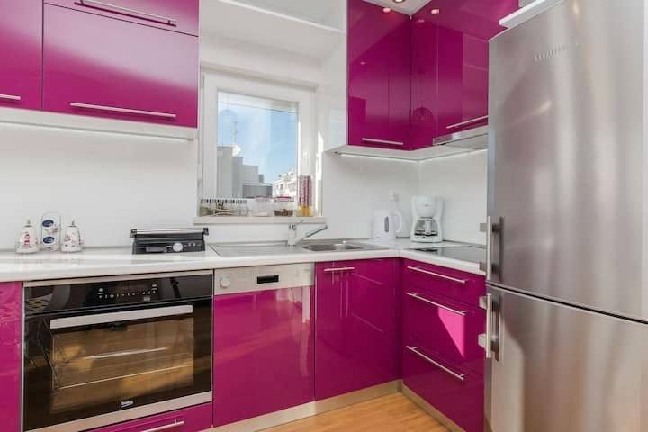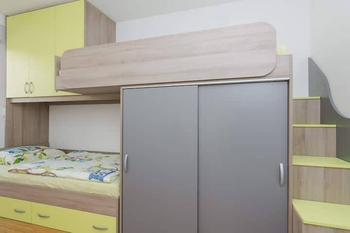 Apartman se sastoji od ulaznog hodnika, tri udobne i prostrane spavaće sobe, dnevnog boravka s kuhinjom i blagovaonicom, dvije kupaonice s tušem i wc-om.