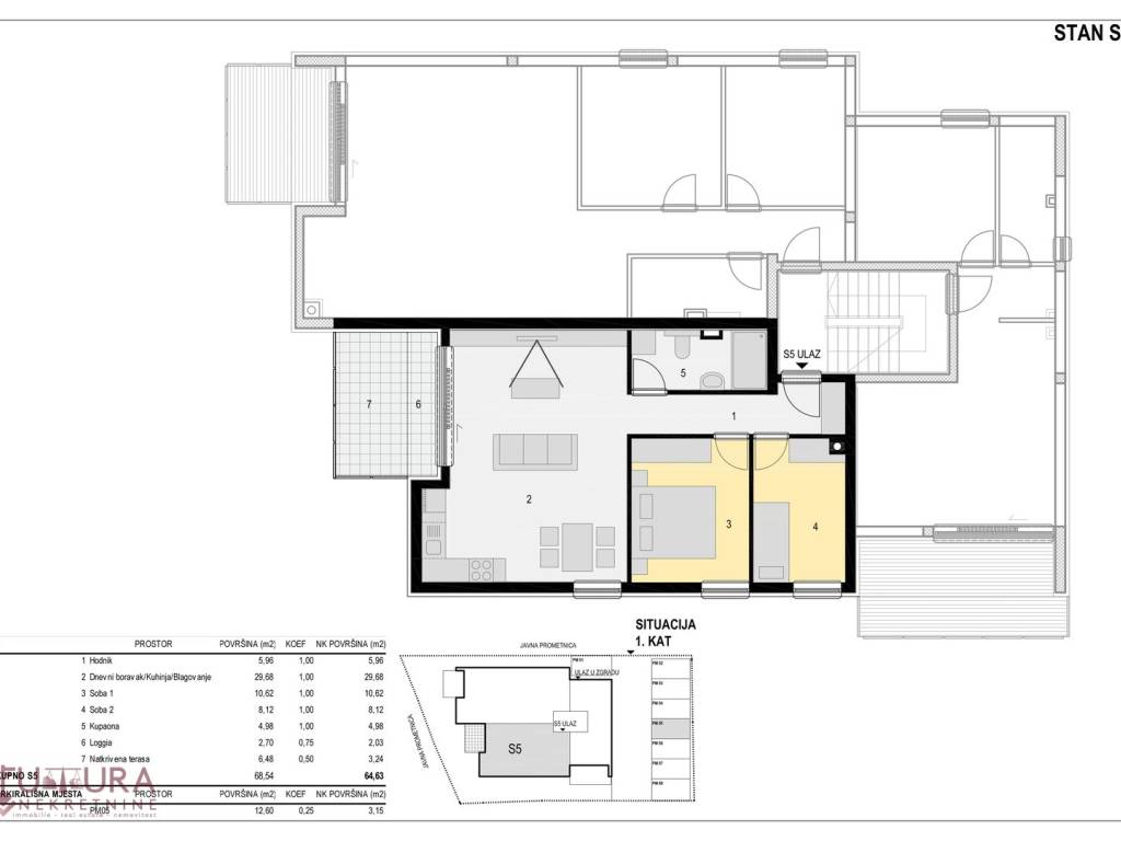 Sastoji se od: dvije spavaće sobe, dnevnog boravka + kuhinja + blagovaona, hodnika, kupaonice i terase.
