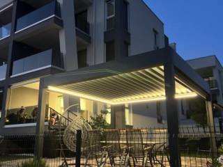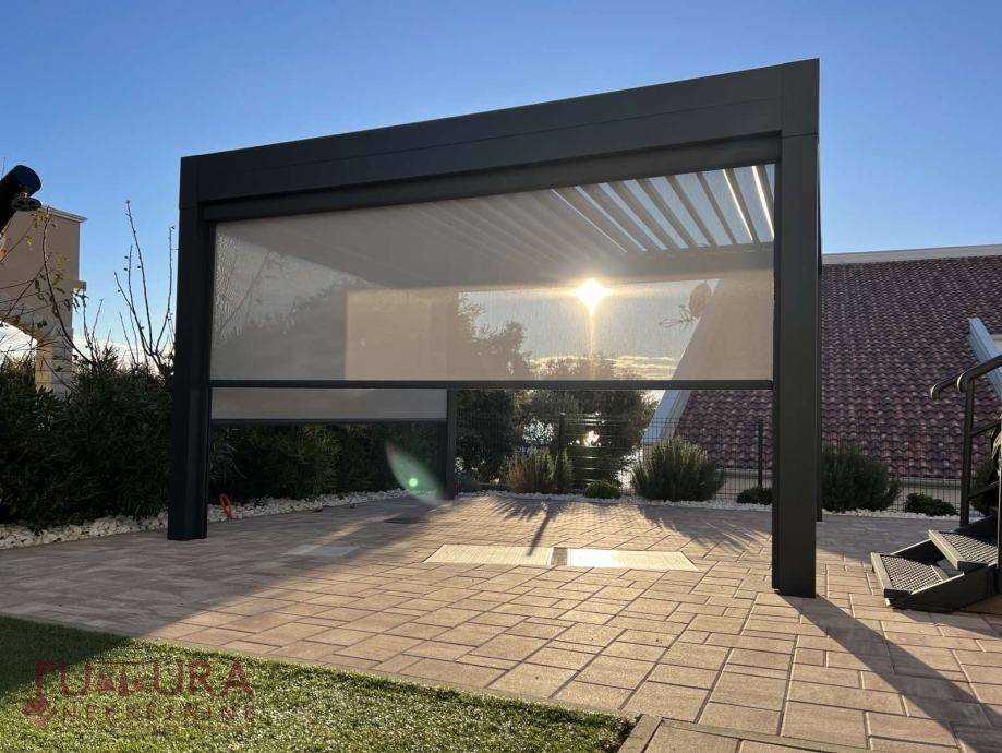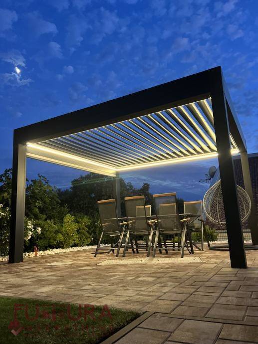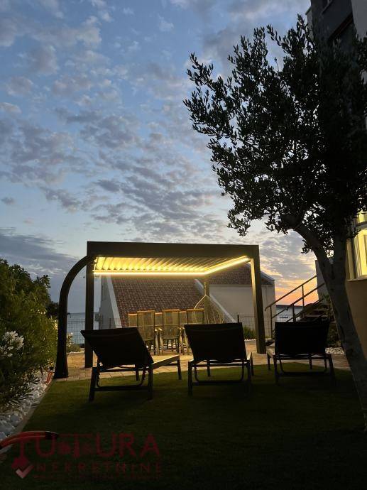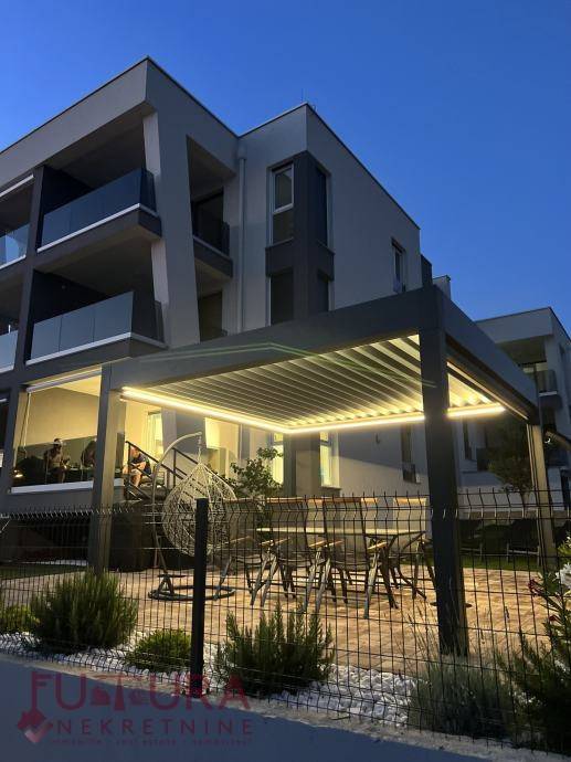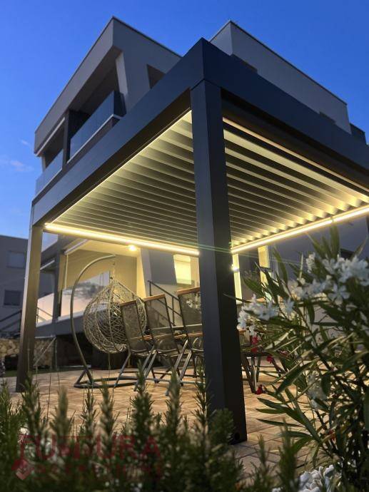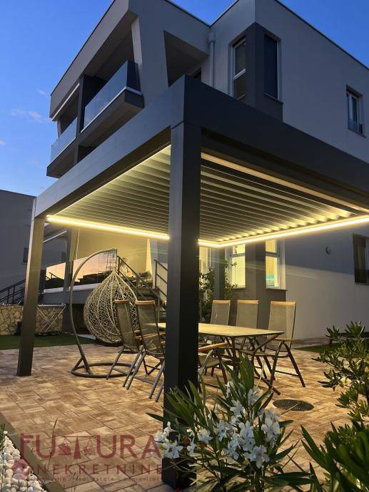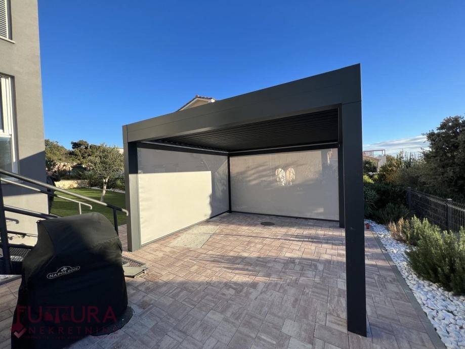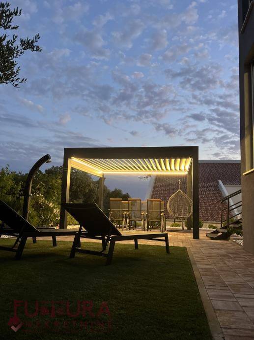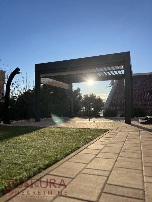 Dvorište je uređeno i ograđeno, postavljena je bioklimatska pergola dimenzija 4 x 4 m u antracit boji s rasvjetom, umjetna trava i popločano kockama.