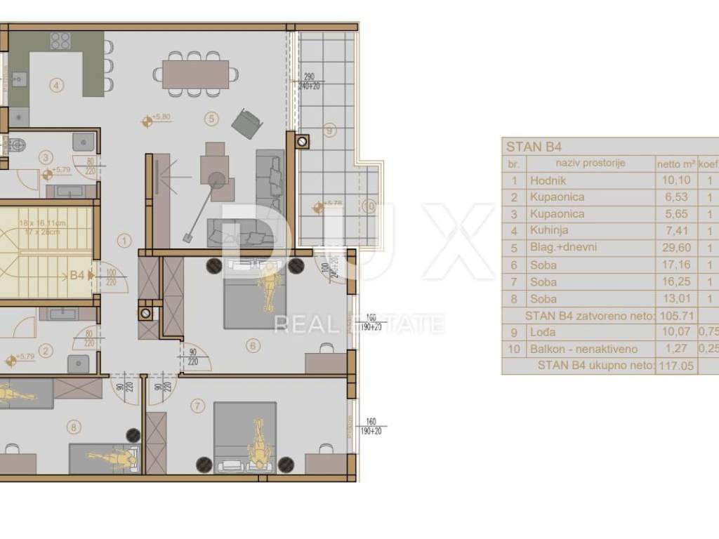 ISTRIA, PULA - Modern new building! Close to the city! Penthouse! LOCATION DESCRIPTION: Not far from the city center, just 1.5km, is this building plot where these 4 new residential buildings will be located. A few minutes away from the city center, close to the Pula bypass, shopping center, supermarket.. all these are items that describe a location that is truly excellent for a new start in family life or a location for a good investment. PROPERTY DESCRIPTION: The apartment in question is located on the second and last floor of a small residential building with only 4 residential units. The apartment is very nicely designed and the living area of the apartment is completely separate from the private area. Immediately upon arrival, we enter the hallway that separates the apartment and on the left we find a spacious living room with a kitchen and dining area and a glass wall that is a source of daylight. The guest bathroom is located right next to the living room, while the private part of the apartment hides three bedrooms and one bathroom. TECHNICAL DESCRIPTION - Bathrooms equipped with electric underfloor heating - Inverter air conditioners - High-quality aluminum joinery in anthracite gray - 10cm facade insulation - High-quality ceramics - Estimated start date of works: May 2025 - Estimated completion date of works: May 2026 Each new owner has the right to choose their own parking space. Smaller apartments have one parking space, while larger apartments have two parking spaces: - uncovered parking space: €7,500 - covered parking space: €18,750 For all questions, additional information and to arrange a viewing date for the property, please contact your agent. Dear clients, the agency fee is charged in accordance with the General Terms and Conditions: www.dux-nekretnine.hr/opci-uvjeti-poslovanja ID CODE: 37525 Aldin Begić Agent pripravnik Mob: +385 95 391 9185 Tel: +385 99 640 8438 E-mail: aldin@dux-istra.com www.dux-istra.com Deniro Osmanović Agent pripravnik Mob: +385 99 371 3802 Tel: +385 99 640 8438 E-mail: deniro@dux-istra.com www.dux-istra.com