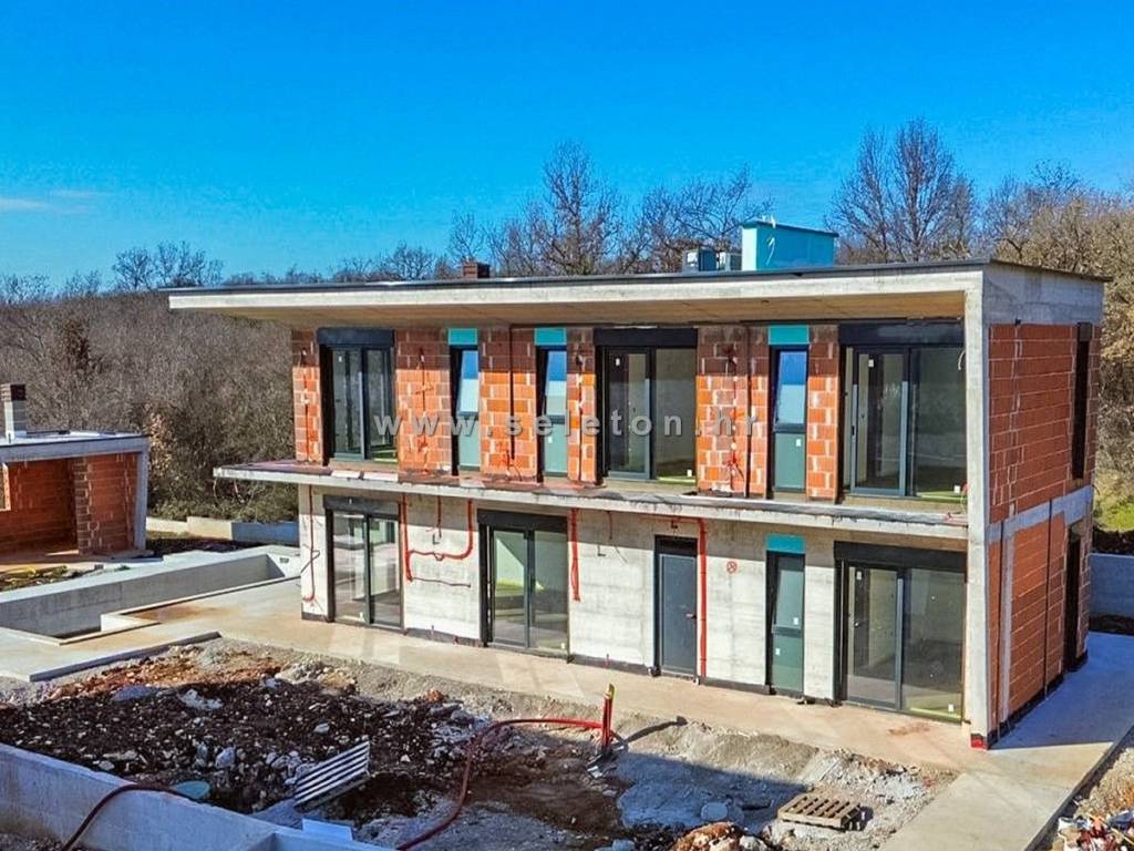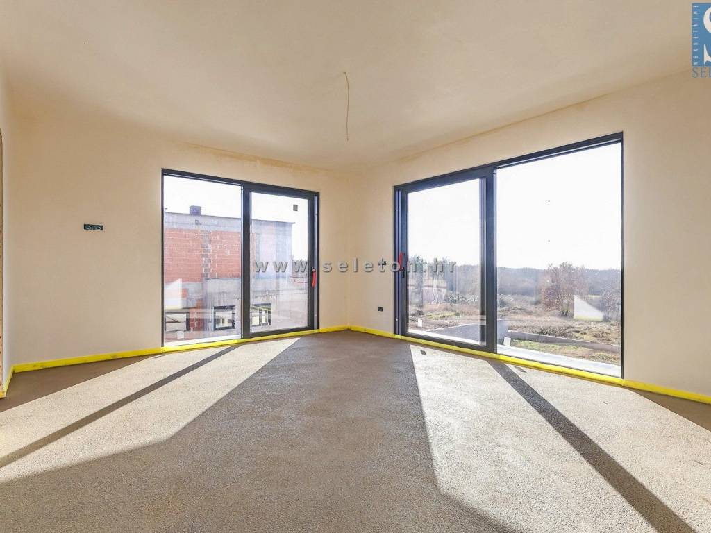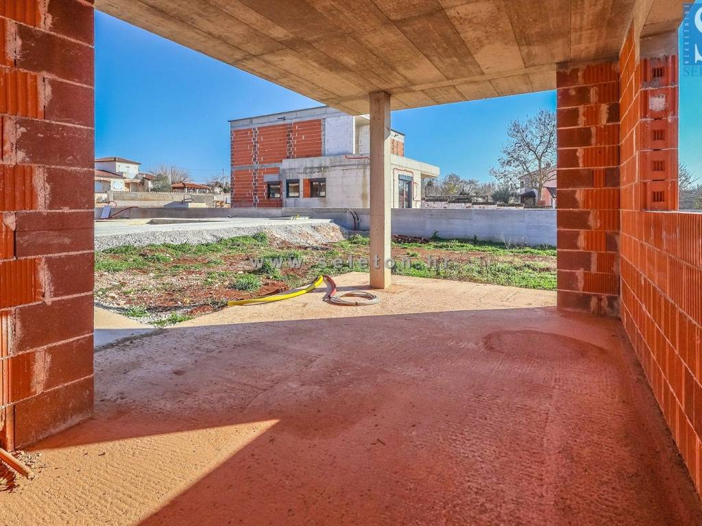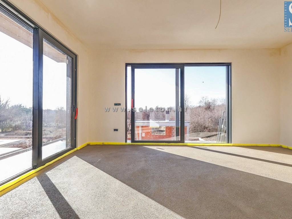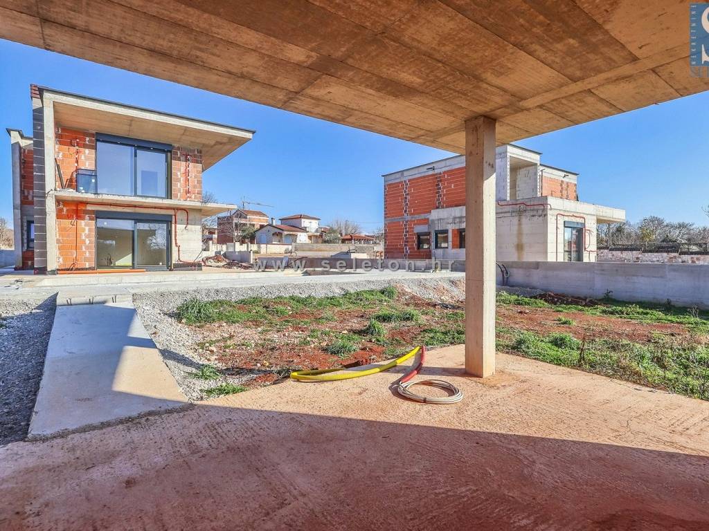 A detached house with a total area of 243 m² is for sale, consists of a living room, kitchen, dining room, terrace, work/technical room, guest toilet and a bedroom with a bathroom on the ground floor of the house, as well as a hallway, three bedrooms with bathrooms and a balcony on the first floor of the house. The house will have a 36 m² swimming pool, a 24 m² summer kitchen and a 5 m² pool storage area, underfloor heating, air conditioning in all bedrooms and in the living room, alarm, automatic garden irrigation, video surveillance and 3 parking spaces. The house is built on a plot of land of 1.080 m², it is located in a village approx. 12 km from the sea/beach and approx. 11 km from Poreč.