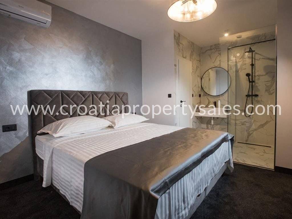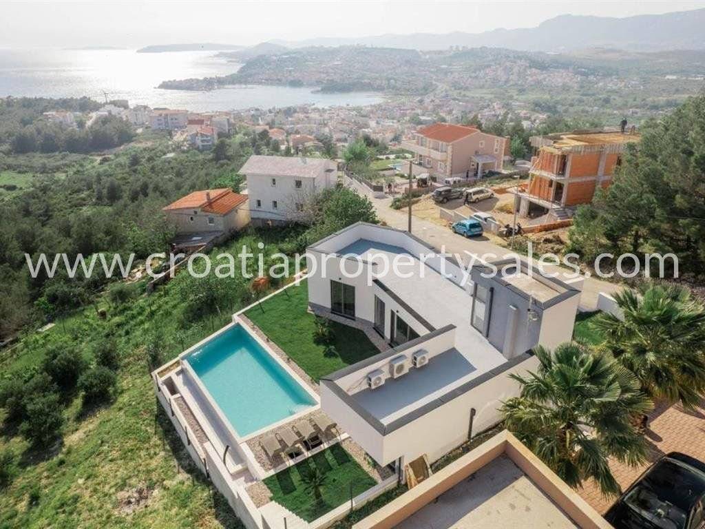 We are pleased to be able to offer you a modern villa with a swimming pool and an open view of the sea and islands not far from the city of Split.This beautiful one-story house has a total of 130 m2 of living space, and it was built on a plot of land of 543 m2.It consists of an entrance hall, a guest bathroom, two bedrooms with their own bathrooms, a kitchen, a dining room and a living room with access to the outdoor terrace where there is an overflow pool measuring 8x4m with a massage bench.The surrounding land is beautifully landscaped, decorated with cascading lawns with planted palm trees and other ornamental plants.The house is fully air-conditioned and, in addition to the air conditioner, it has the option of connecting the floor heating to water.The property is already established in tourism and is ideal for those whose goal is to continue a profitable tourism business or to use it for their own use during the year, given the immediate proximity of the city of Split, the airport and other facilities essential for everyday life.
