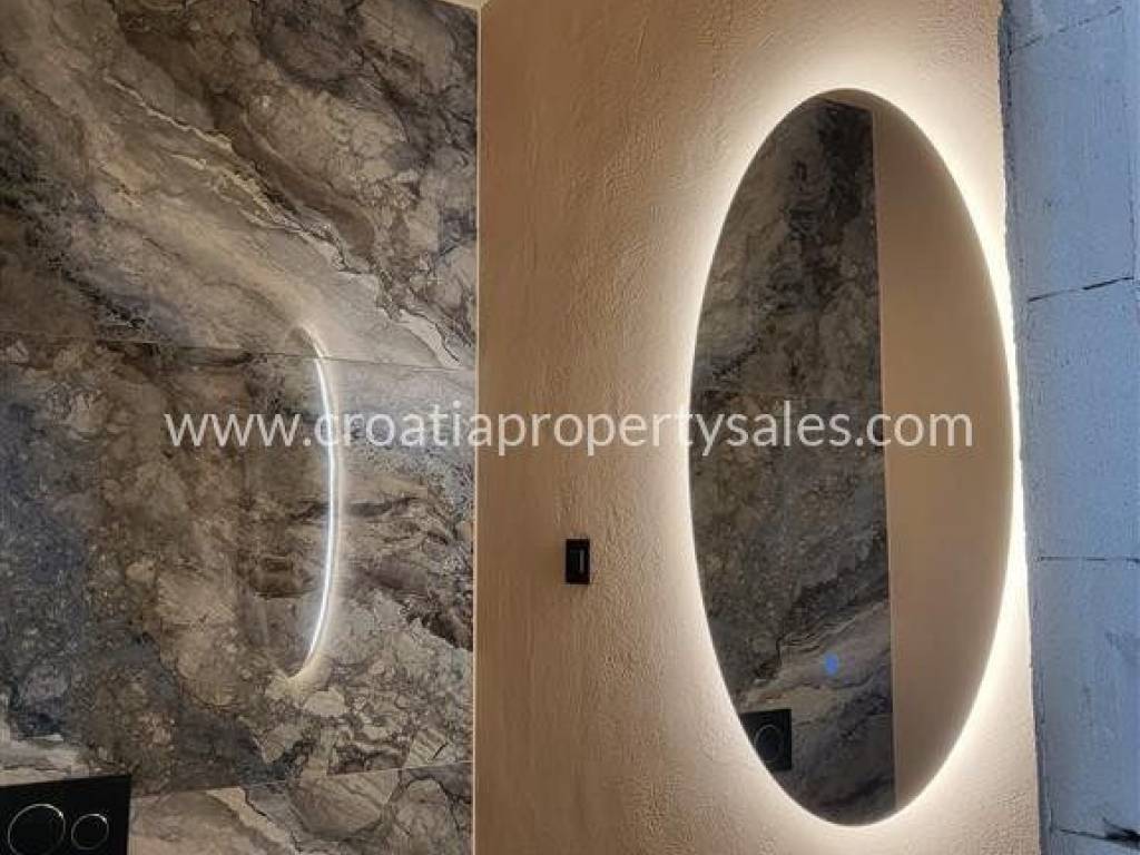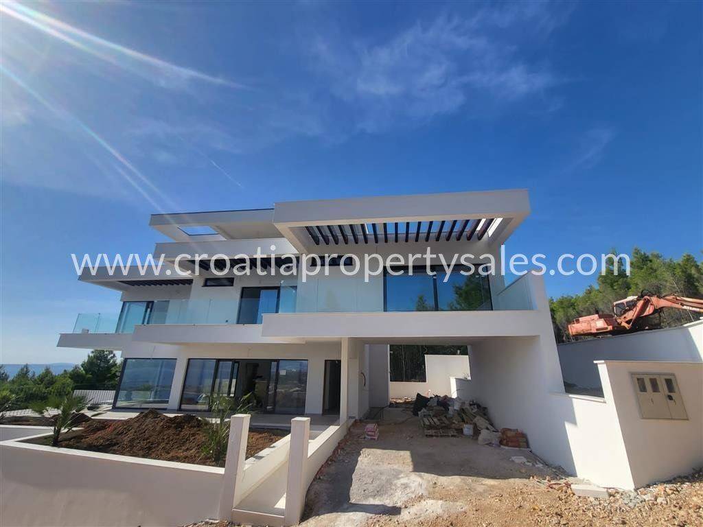 A luxury villa of 500 m2 located on a plot of 575 m2, located in a picturesque small town on the Omis riviera on a hill with a beautiful panoramic view.It consists of a basement, ground floor and two floors.In the basement there is a room of 70 m2 in which there is a technical room, as well as a laundry room, a gym and a sauna.On the ground floor of 180 m2, there is a guest toilet, kitchen, dining room and living room with large window openings that give the space airiness and brightness. From the living room you can access the terrace with a sun deck and a large infinity pool.Wooden stairs lead to the first floor of 149 m2, where there are 3 bedrooms, each with its own bathroom and terrace. On the second floor of 102 m2 there is a master bedroom with a bathroom and a large covered and uncovered terrace.During the construction and decoration of the villa, top quality materials were used to provide the future user with maximum comfort.Air conditioners are provided for heating and cooling in every room, and an addition for winter is underfloor heating in the entire villa, and a built-in modern fireplace in the living room.The surroundings of the villa are planted with native Dalmatian plants and olive and palm trees. Outdoor covered parking for 3 cars is located on the north side of the villa.This beautiful modern villa is our recommendation for anyone who wants to live in a quiet location near untouched nature and walking and hiking trails that offer a break from everyday busy life.