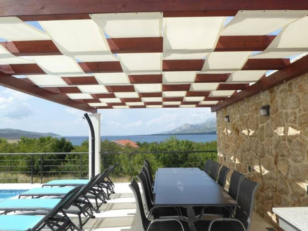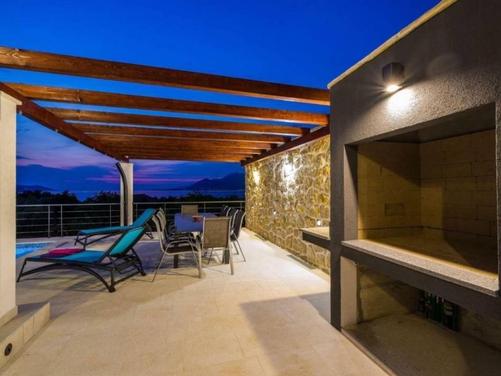 In the immediate vicinity of Zadar, an elegant villa with a swimming pool and an open sea view is offered for sale. The property is situated on a 700m2 plot and features 270m2 of living space distributed over three floors. Thanks to its position on a cascading, elevated terrain and the large garden located in front of the villa, further construction in front of the property is not possible, ensuring a permanently unobstructed sea view.   The ground floor features a spacious open-plan area combining the kitchen, dining room, and living room. This space is connected to the outdoor terrace through large glass walls, allowing for an abundance of natural light and offering a magnificent sea view. This level also includes a hallway, a bathroom, a separate guest toilet, a garage, and a storage room.   An internal staircase leads to the upper floor, where four bedrooms are located. Two of the bedrooms have their own en-suite bathrooms and private access to a terrace. An additional guest bathroom is also situated on this floor. The top floor consists of a rooftop terrace featuring an enclosed and covered lounge area as well as a spacious sun deck. From this level, one can enjoy a panoramic view of the sea and the surrounding mountains.   The landscaped and paved courtyard includes a sunbathing area, a swimming pool of approximately 30 m², a covered outdoor dining area, and a barbecue.   Thanks to its attractive location, elevated position, permanently protected sea view, and high-quality construction, this property represents an excellent opportunity for luxury family living, a holiday home, or an investment in tourist rental.
