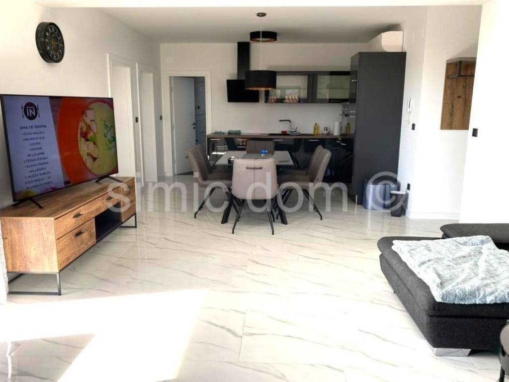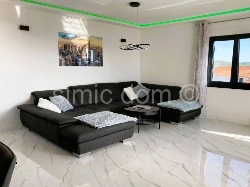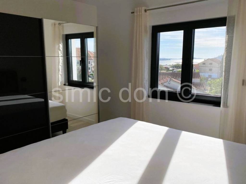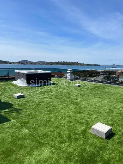 A fully furnished entire floor of the second floor of a newer building, for sale only 50m from the beach, with a beautiful view of the sea and the entire archipelago. The floor consists of a large apartment and a studio apartment, and the floor plan and layout of the rooms allow the entire floor to be one large apartment. The floor has an internal area of 98 m2 and another 14.89 m2 of covered terrace, and there is also a roof terrace of 110 m2 with a jacuzzi and two parking spaces in the courtyard of the building. With the coefficients of all property accessories included, it has a net usable area of 137 m2. The beautiful large penthouse apartment consists of two bedrooms, a bathroom, a kitchen with a connected dining room and living room and a spacious terrace. Depending on the owner's wishes, the studio apartment can easily fit into the floor plan of the large apartment and thus be used as a third bedroom with an en-suite bathroom. The apartments are air-conditioned, equipped with underfloor heating, furnished and ready to move into. All furniture and equipment are included in the price. Each apartment in the building has its own meter for electricity and water. The apartment is in a great location, close to cafes, restaurants and a few minutes' walk from shops.