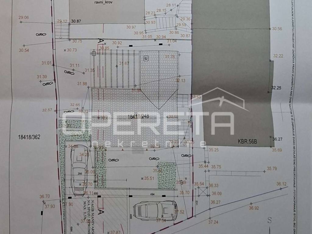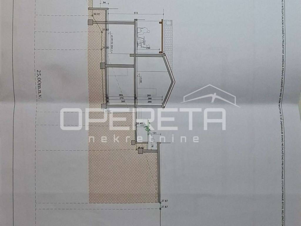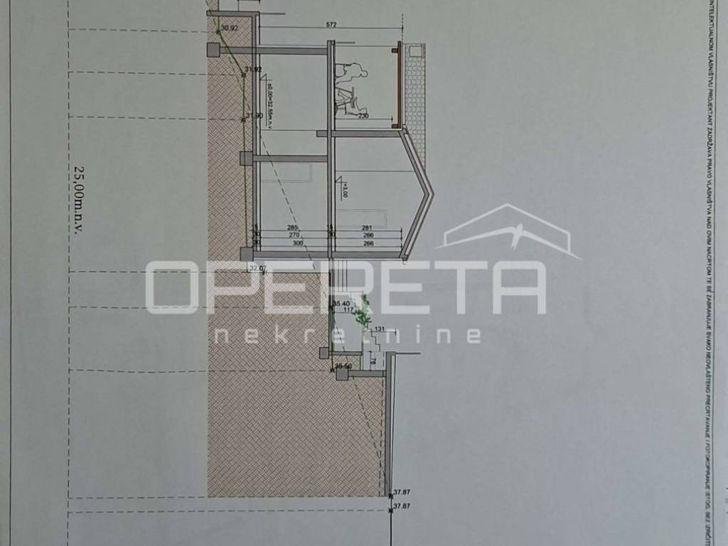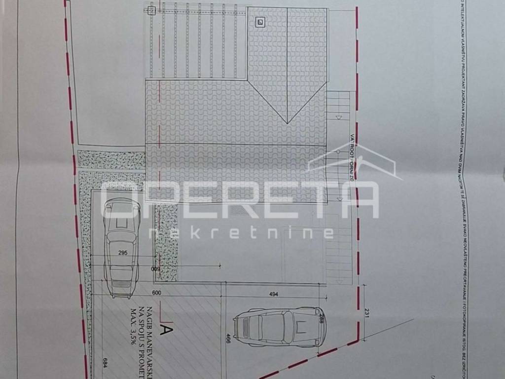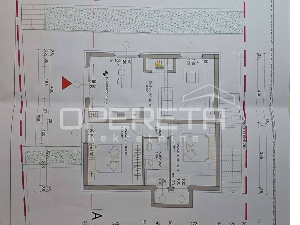Prizemlje kuće, prema planu građevinske dozvole, sastoji se od dvije spavaće sobe, dnevnog boravka, hodnika i kupaonice s WC-om dok se na prvom katu nalazi dnevni boravak koji komunicira s kuhinjom, spavaća soba, kupaonica s WC-om i prostrana terasa.