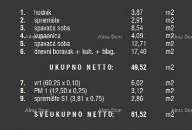 We are selling an apartment in a new residential complex in Štinjanj. The complex consists of 19 two-story residential buildings. The location of the new residential complex is excellent, just one kilometer from the center of Štinjanj and in close proximity to an elementary school, kindergarten, the city beach Hidrobaza, pharmacy, and only four kilometers from the center of the city of Pula, and three kilometers from the center of the village of Fažana. Access to the residential complex is secured from an asphalted surface, which will contain all necessary infrastructure (electricity, water, sewage).Apartment 11A, with an internal area of 49.52 m², is located on the ground floor of the building and consists of: a hallway, living room with kitchen and dining area, 2 bedrooms, bathroom, storage room, terrace, and garden.What makes this project special is the architectural design of the facade of the residential buildings and the green roofs that appear on the facade.Each residential unit is provided with the required number of parking spaces according to the urban plan of the city of Pula, measuring 2.50m x 5.00m. Each parking space is designed with a future connection to the electricity grid for the purpose of connecting chargers for electric vehicles.This apartment comes with 1 parking space and a storage room - included in the price.We are accepting reservations!For more information, please contact:Azra +385 91 611 5706 +385 98 420 885 azra@almadominvest.com