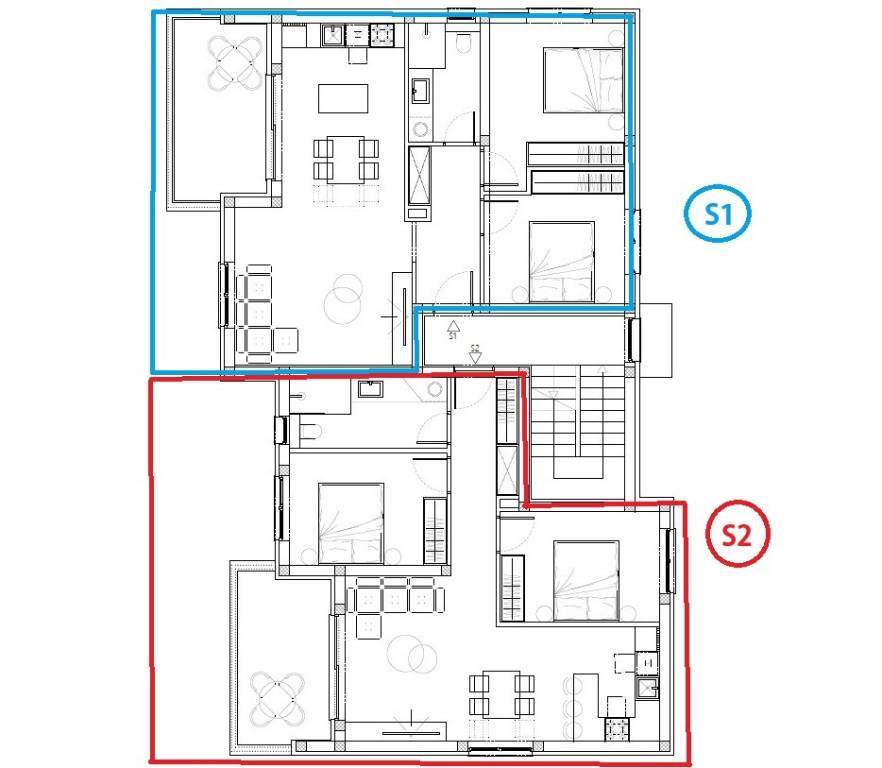 El apartamento S1 se encuentra en el primer piso de un edificio residencial con un total de seis unidades habitacionales (dos en cada planta – planta baja, primer y segundo piso).