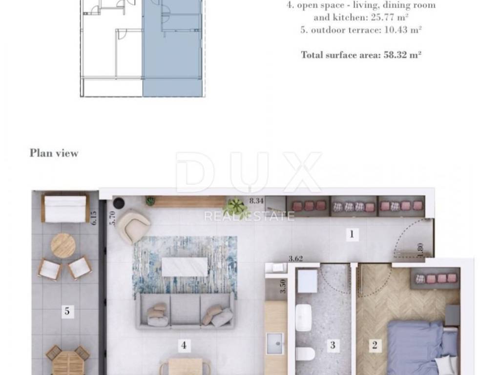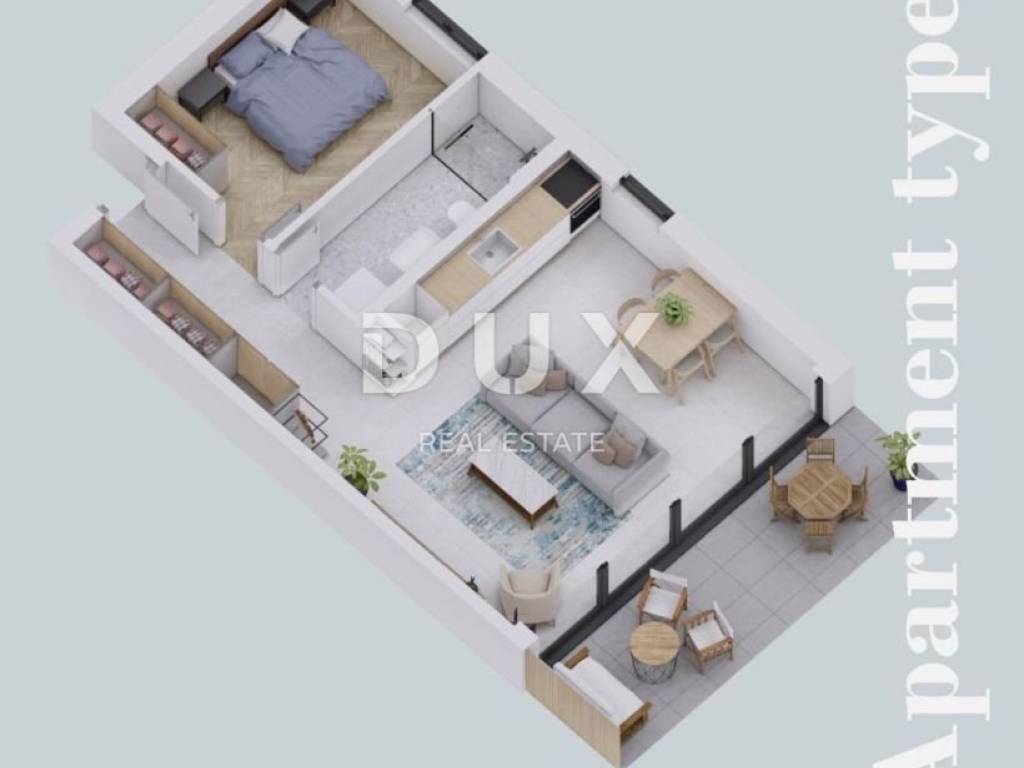Upon entering the apartment, there is a lobby with a designated space for a wardrobe, which then leads us to the living area of the apartment. Here you have the opportunity to spend your time in an "open space" area, without partition walls, and where there is a space designated for a modern kitchen, dining room and comfortable living room. What adorns this part of the apartment are large sliding glass walls that allow a rich amount of natural light to penetrate the apartment, and which are also used to access the outdoor covered terrace of 10.43m2.