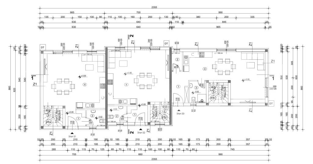 Kuće se sastoje od prizemlja u kojem se nalazi ulazni hodnik, spremište, dnevni boravak s kuhinjom i blagavaonicom, wc-a/kupaonice, a na katu se nalaze tri spavaće sobe i kupaonica.