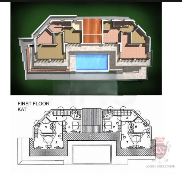 Projekt je osmišljen za katnicu s bazenom koja se sastoji od suterena, prizemlja i kata neto površine 471 m2.
