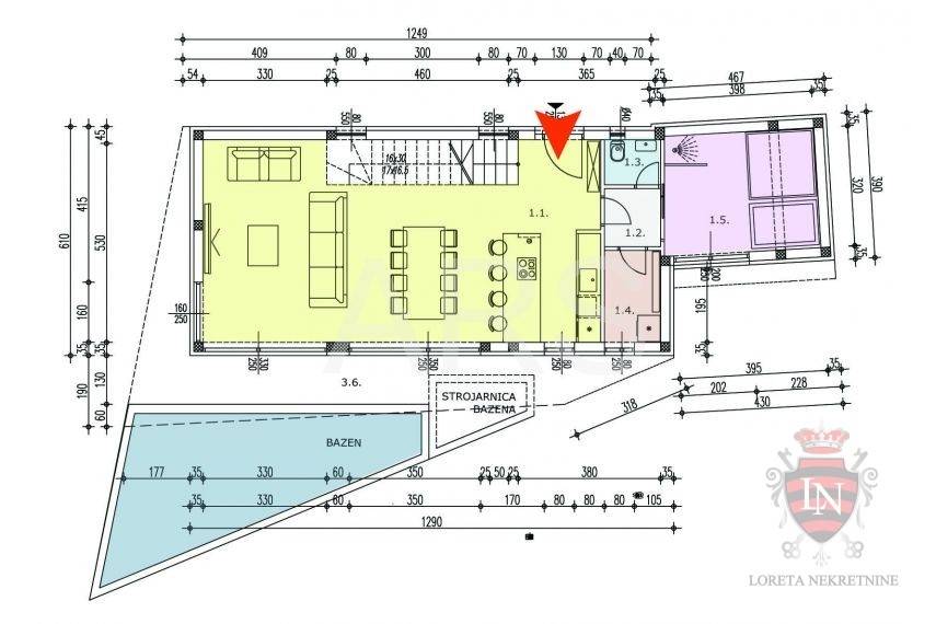 Idejnim projektom predviđena je moderna katnica s bazenom. Prizemlje, površine 99.71 m², obuhvaća prostranu kuhinju s blagovaonom i dnevnim boravkom, wc, pomoćnu prostoriju i luksuzni wellness. Unutarnje stepenice vode na kat, površine 198.17 m², gdje su smještene tri spavaće sobe s en suite kupaonicama te balkon koji pripada jednoj sobi.