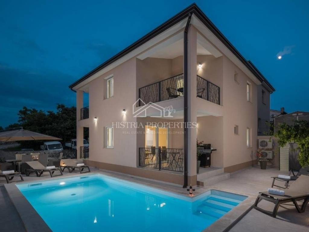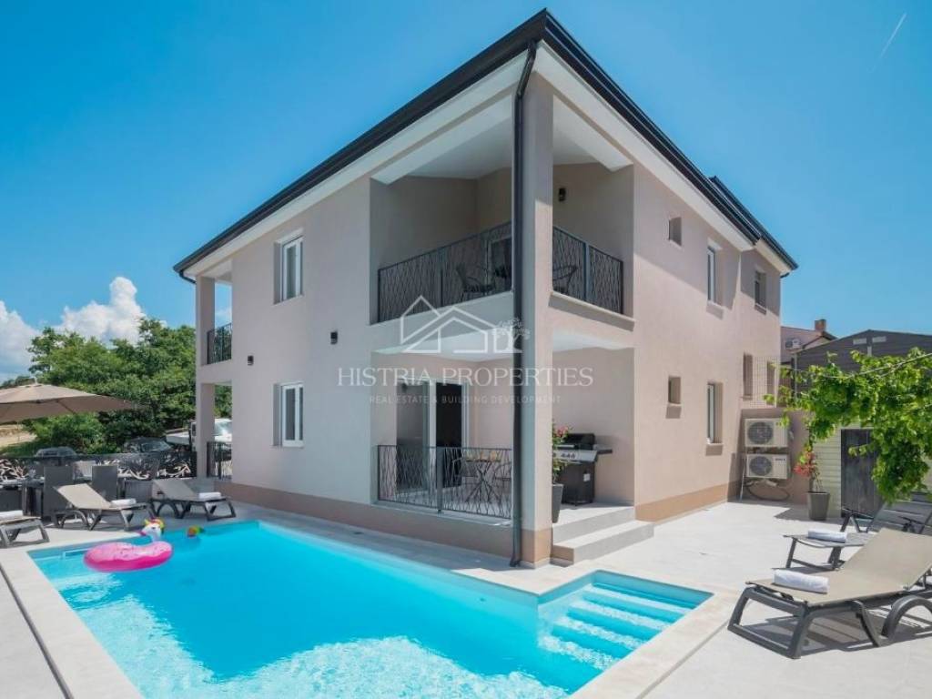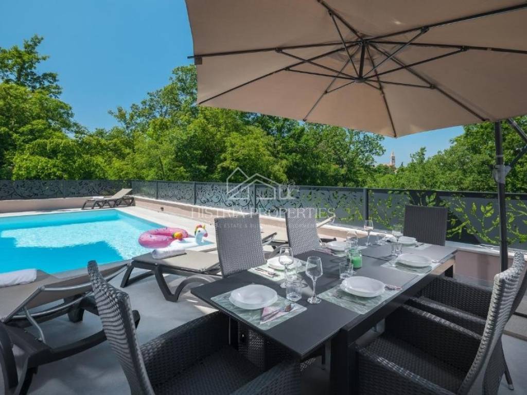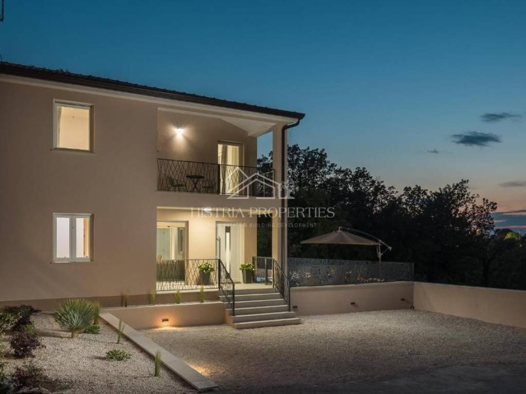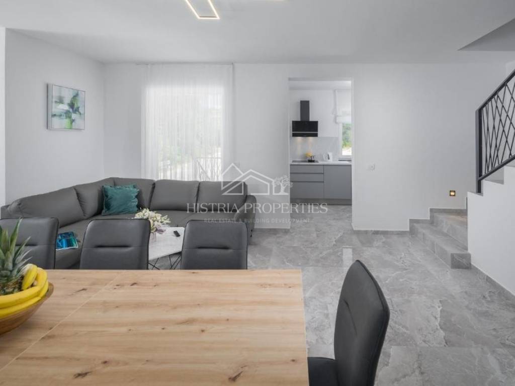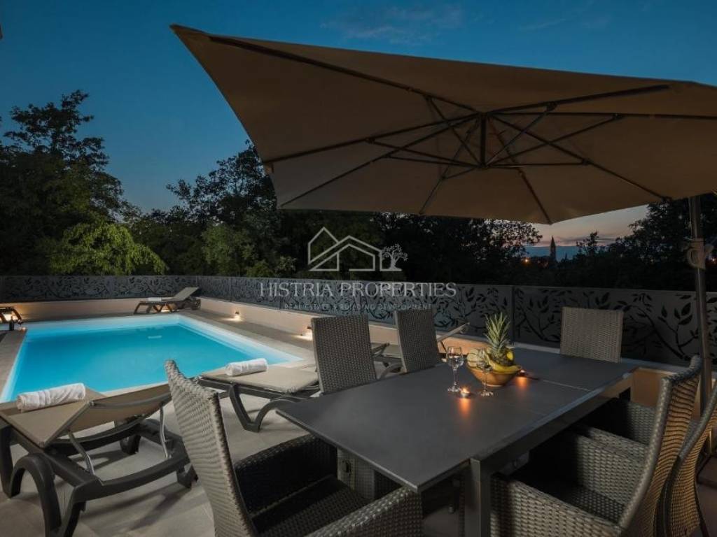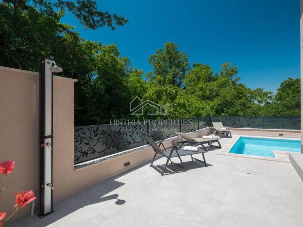 In the vicinity of the city of Poreč, in a peaceful settlement surrounded by forests and nature, this new house with a swimming pool is for sale.