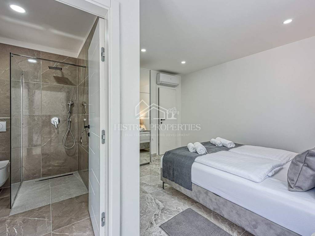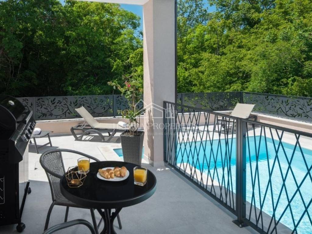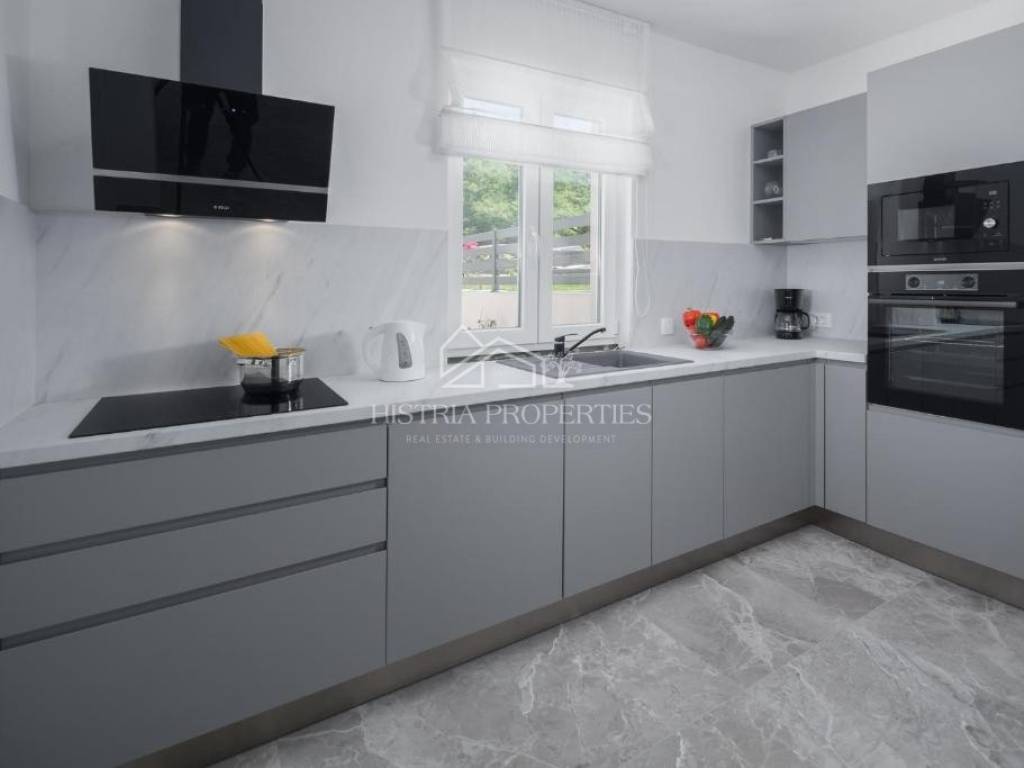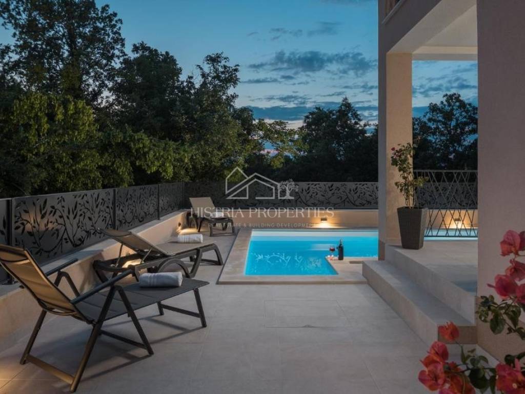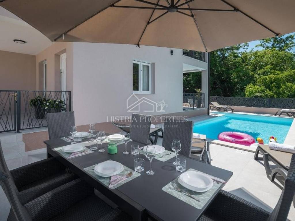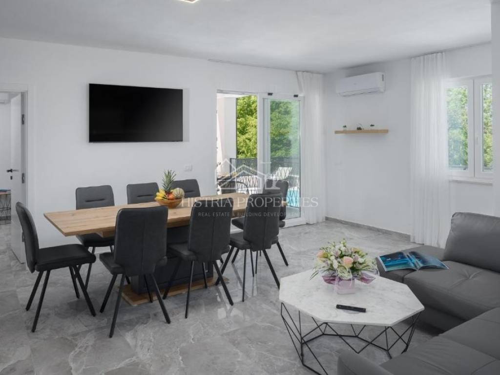 In the vicinity of the city of Poreč, in a peaceful settlement surrounded by forests and nature, this new house with a swimming pool is for sale.
