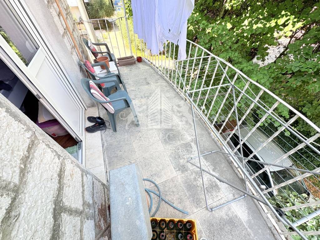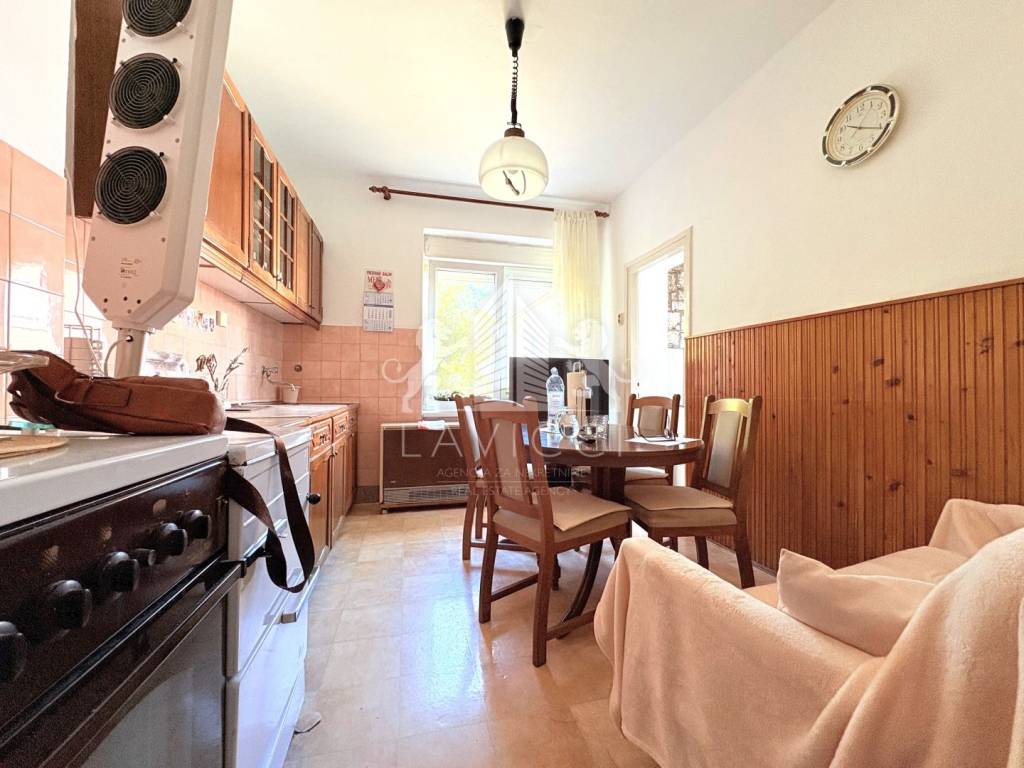 The apartment is located on the first floor of a small residential building. It consists of an entrance area and hallway, a living area with a kitchen and dining room, which opens onto a loggia, two large bedrooms, a terrace and a small storage room. There is a woodshed in the basement of the building, while in front of the building there is a shared free parking lot for all tenants. The apartment has ALU-PVC joinery.