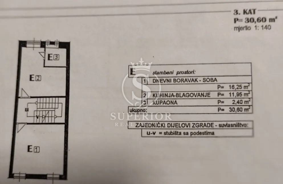 The apartment is located on the 3rd floor of a residential building and has a living area of 30 m², with an associated attic of 16 m², providing additional potential for expansion or flexible use of space.