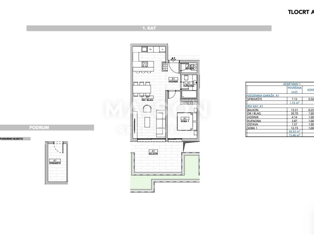 The apartment is equipped with high-quality triple oak parquet, Schuco aluminum joinery with triple glazing, and electric exterior blinds. Underfloor heating is installed throughout the apartment via a heat pump, and the exterior facade is ventilated, contributing to energy efficiency.
