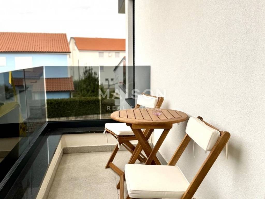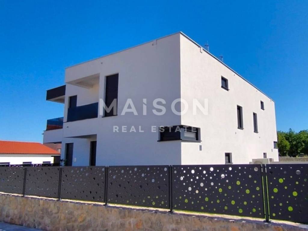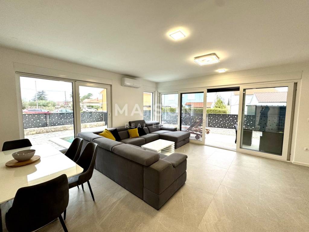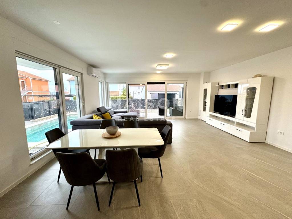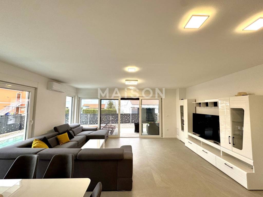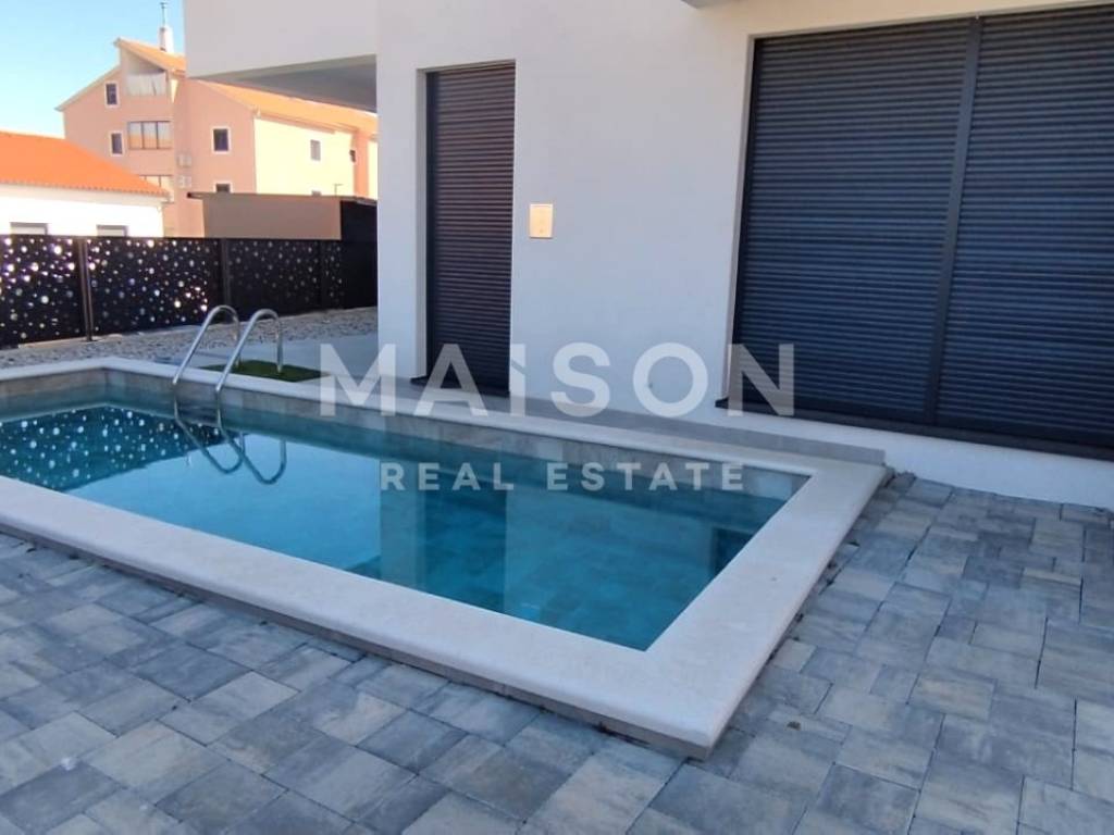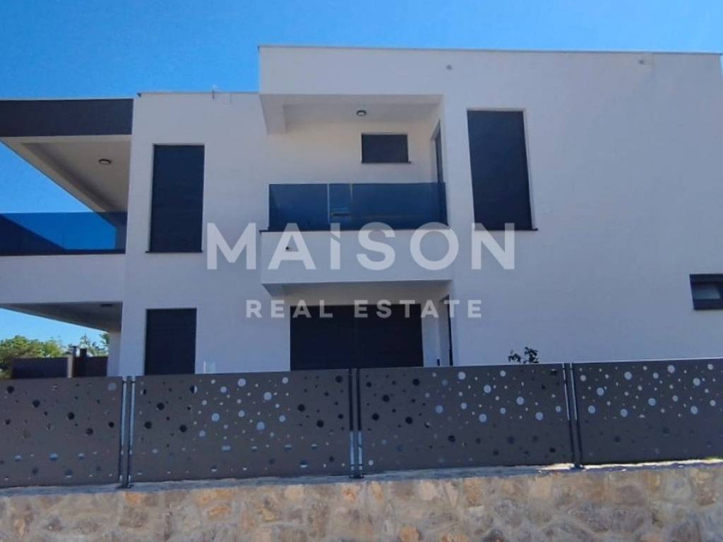 In a quiet part of Malinska, just 600 metres from the sea, this modern semi-detached house with a swimming pool offers an ideal opportunity for both holiday living and investment. This high-quality new build combines contemporary comfort with a functional layout. The ground floor features a bathroom, storage room, and a spacious open-plan kitchen, dining, and living area that opens onto a covered terrace and sun deck with a pool. The upper floor comprises three bedrooms, each with its own bathroom and access to a balcony, ensuring maximum privacy and comfort.