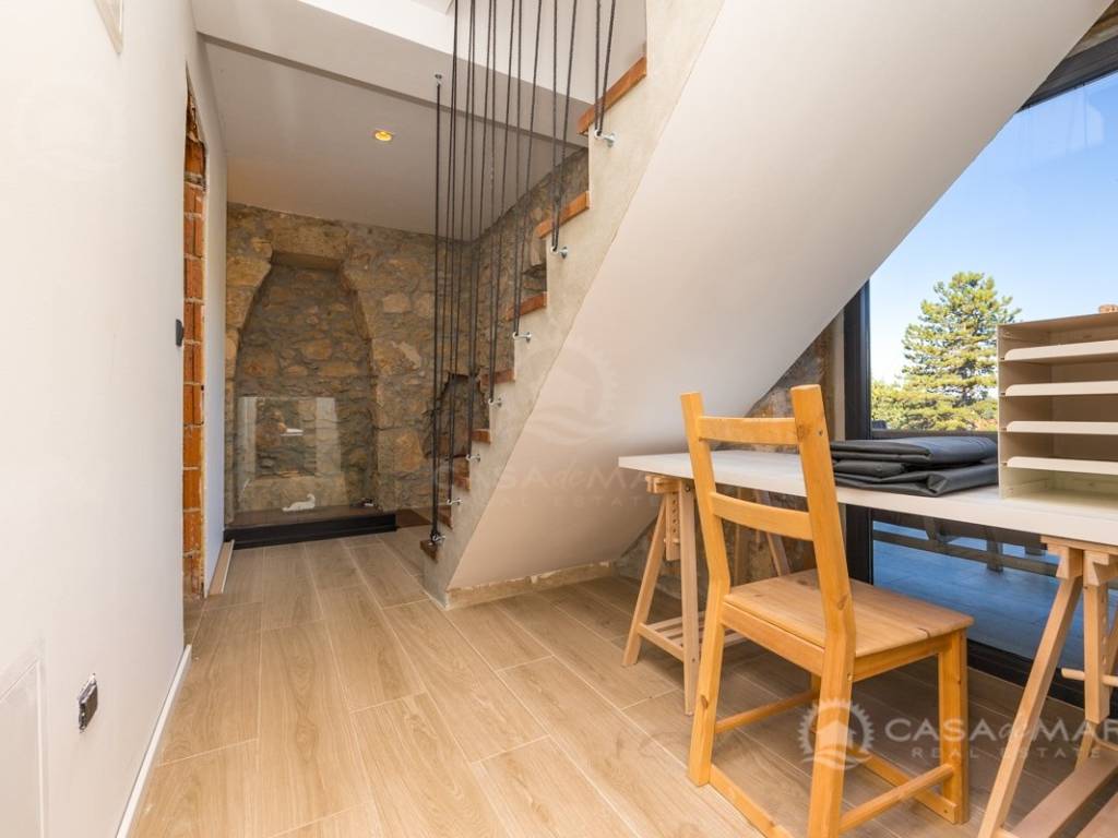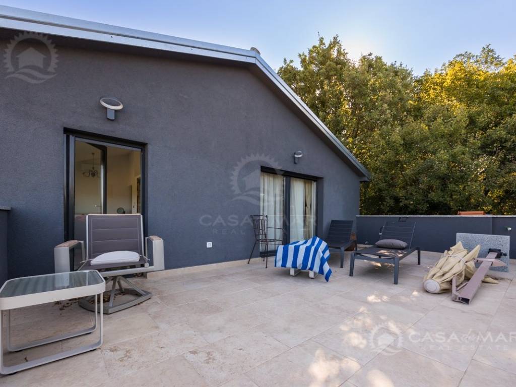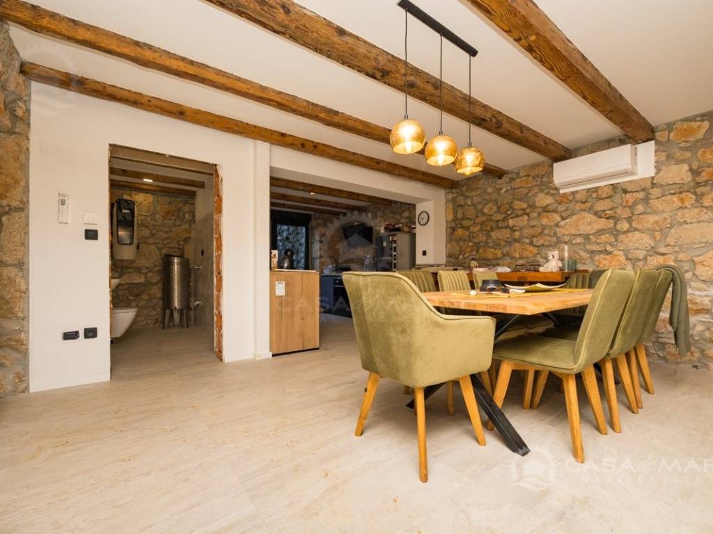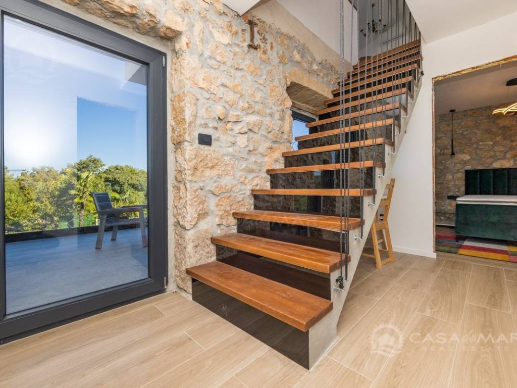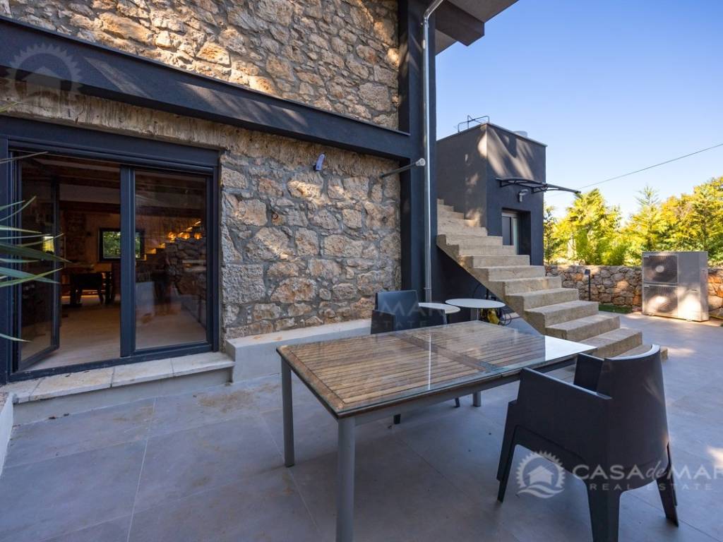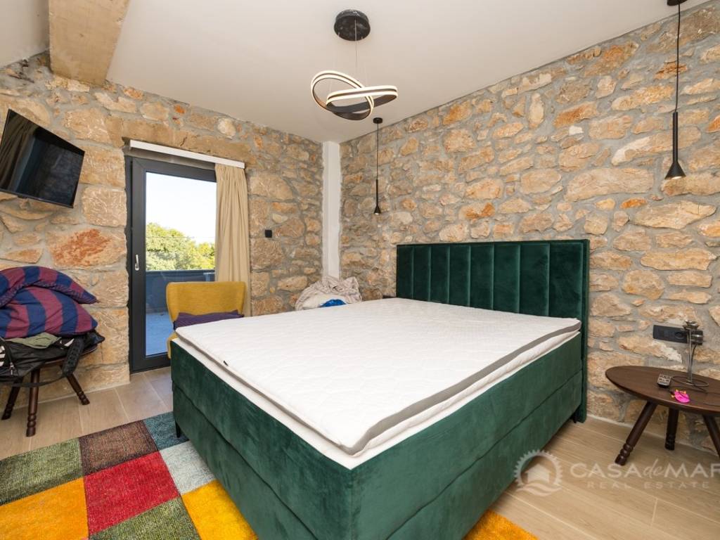 Renovated detached modern stone house with pool The house is currently in the renovation phase, it spreads over 253m2 of living space over three floors connected by internal stairs. The ground floor has a comfortable living room, kitchen with dining area and one toilet. The first floor consists of two bedrooms, two bathrooms and a terrace. On the second floor is another spacious bedroom with bathroom and great terrace. The house has a charmingly landscaped garden with a swimming pool with sun deck and garden barbecue. The building has been renovated with excellent quality materials, PVC joinery with mosquito nets and electric shutters, and high quality ceramics. The living room and bedrooms are air conditioned, and heating is provided via a heat pump via radiators and underfloor heating systems throughout the house. It is located in a quiet location on the edge of the green belt, only five to ten minutes away from beaches, larger places, restaurants and other facilities, which makes this property perfect for personal use but also for rent during the tourist season.
