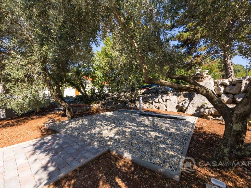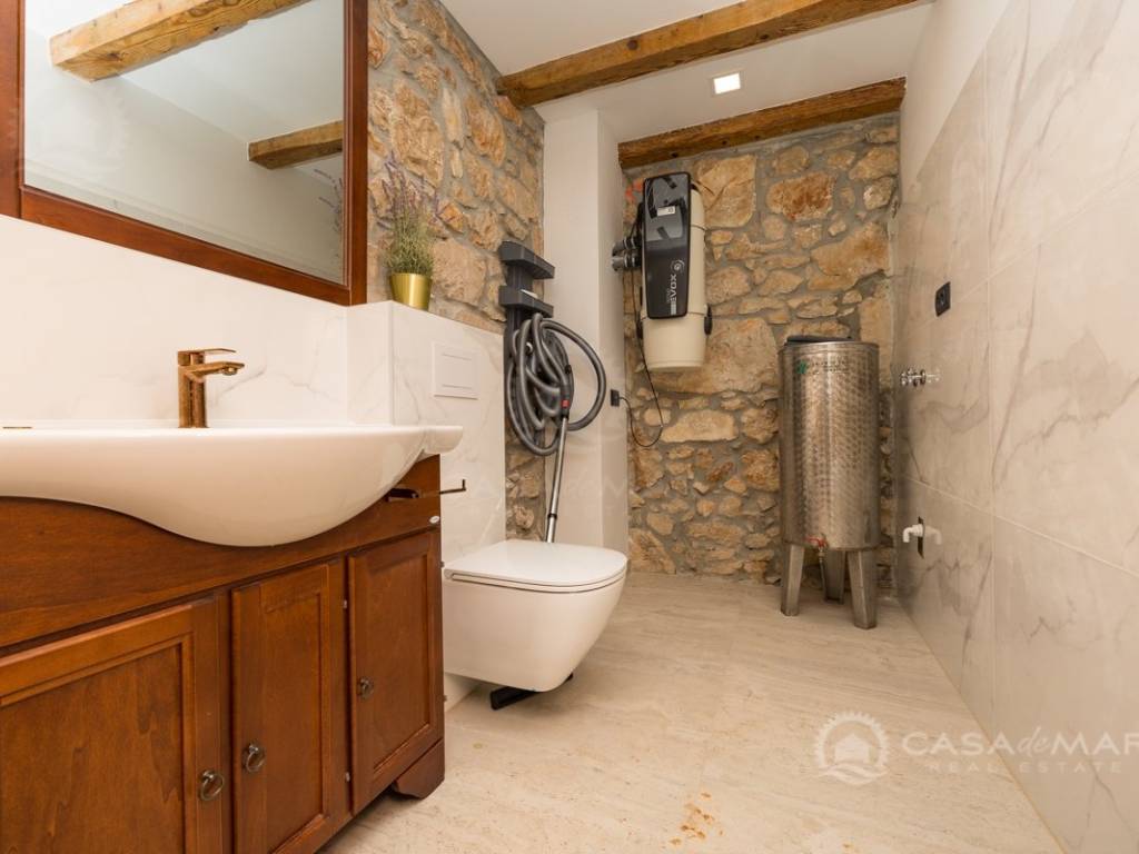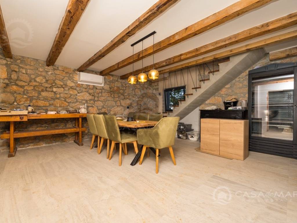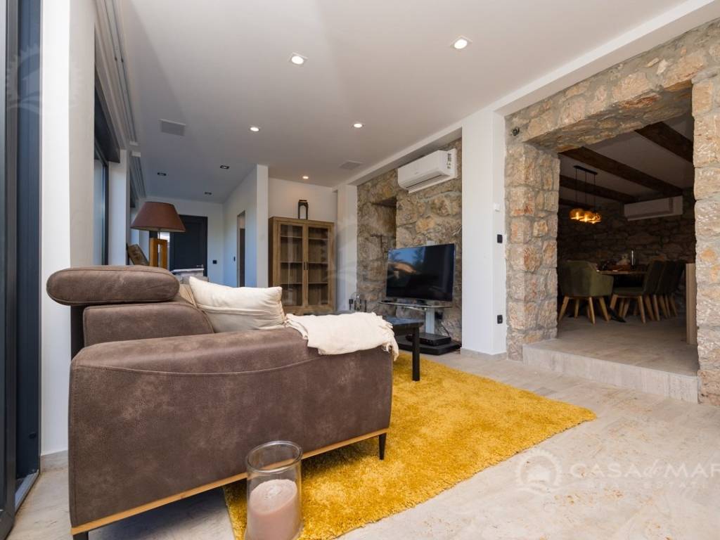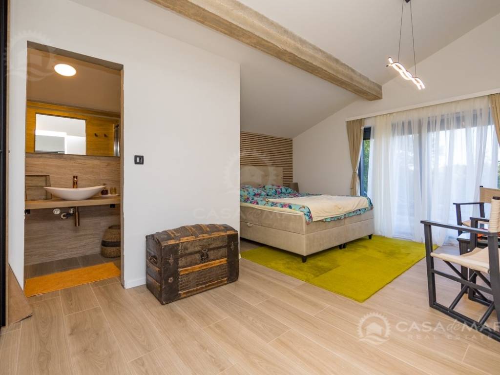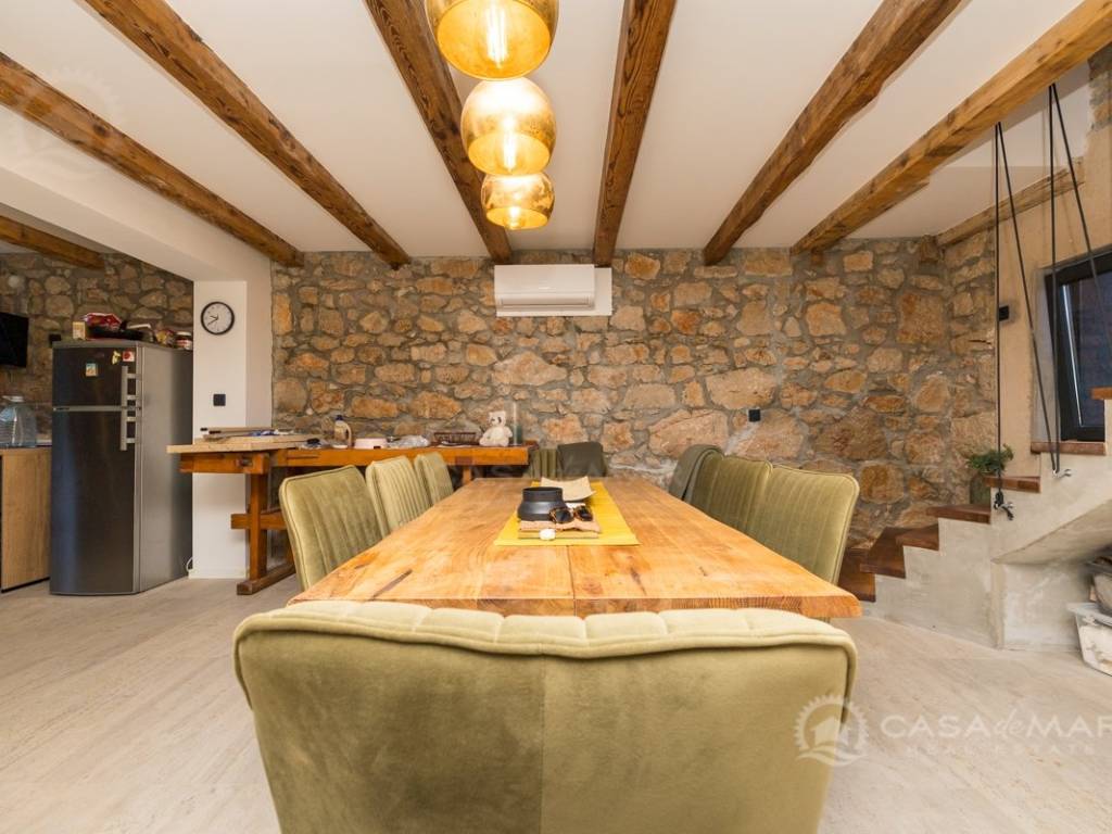 Renovated detached modern stone house with pool The house is currently in the renovation phase, it spreads over 253m2 of living space over three floors connected by internal stairs. The ground floor has a comfortable living room, kitchen with dining area and one toilet. The first floor consists of two bedrooms, two bathrooms and a terrace. On the second floor is another spacious bedroom with bathroom and great terrace. The house has a charmingly landscaped garden with a swimming pool with sun deck and garden barbecue. The building has been renovated with excellent quality materials, PVC joinery with mosquito nets and electric shutters, and high quality ceramics. The living room and bedrooms are air conditioned, and heating is provided via a heat pump via radiators and underfloor heating systems throughout the house. It is located in a quiet location on the edge of the green belt, only five to ten minutes away from beaches, larger places, restaurants and other facilities, which makes this property perfect for personal use but also for rent during the tourist season.