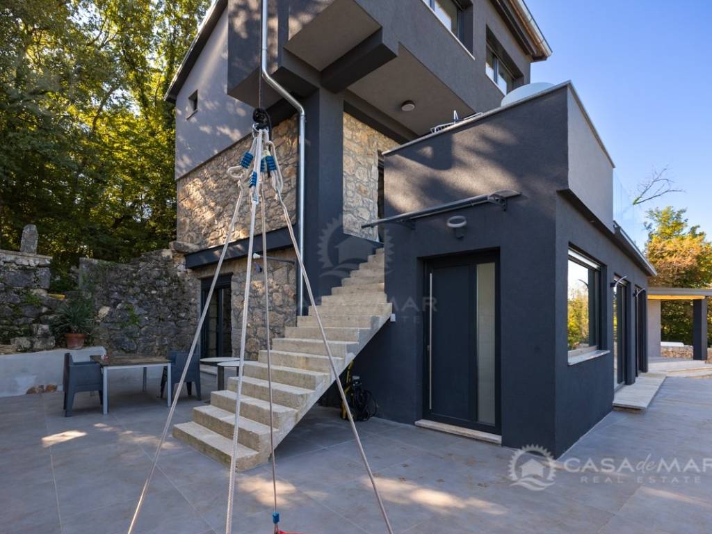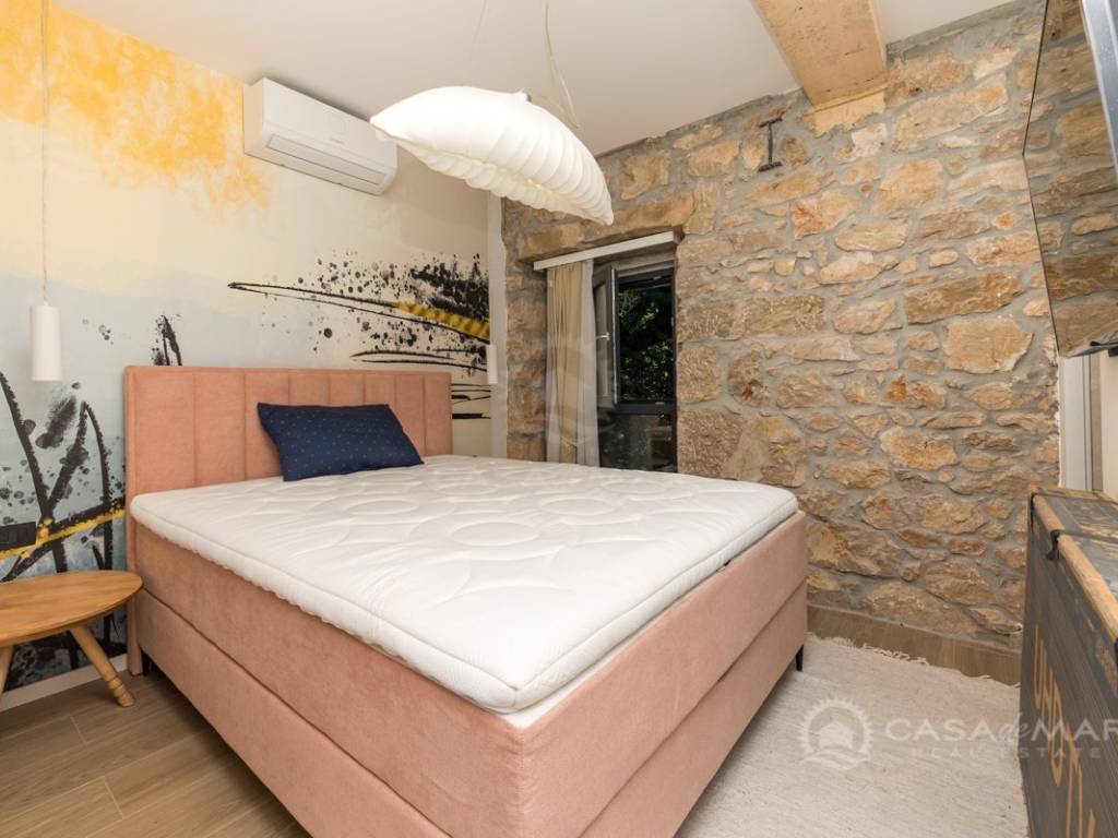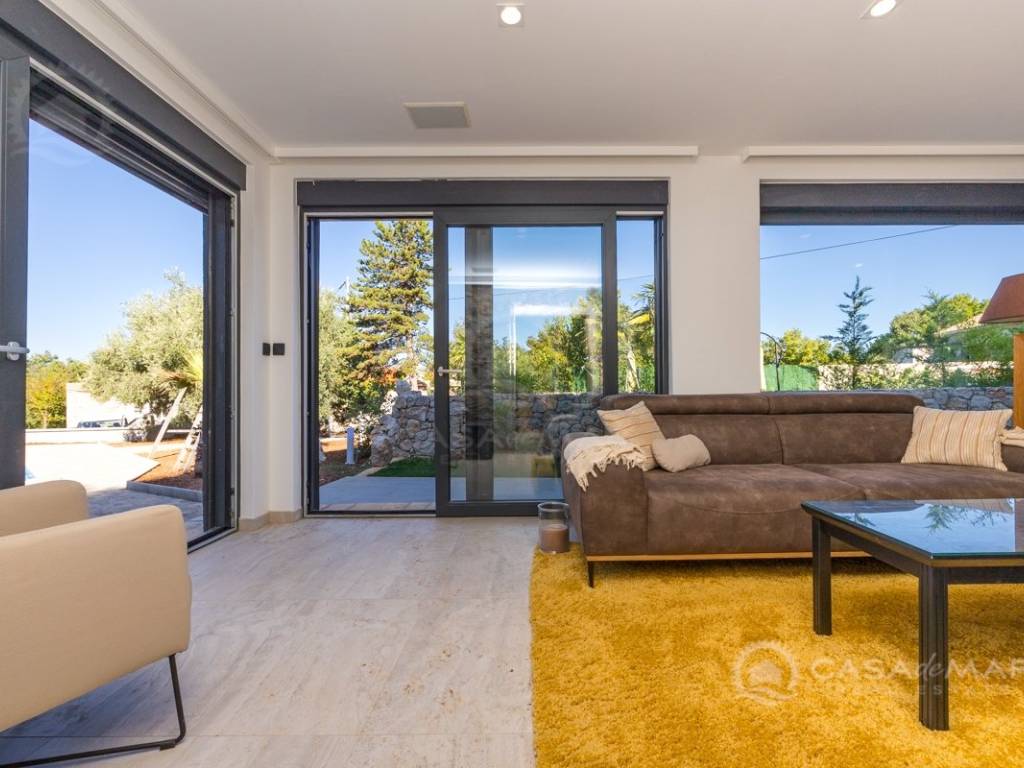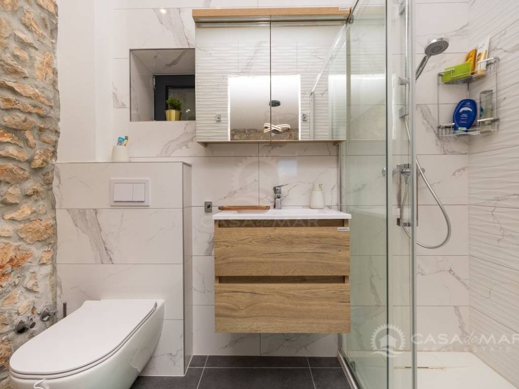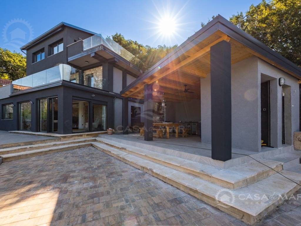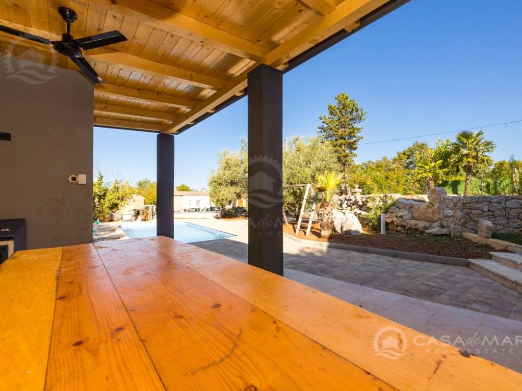 Renovated detached modern stone house with pool The house is currently in the renovation phase, it spreads over 253m2 of living space over three floors connected by internal stairs. The ground floor has a comfortable living room, kitchen with dining area and one toilet. The first floor consists of two bedrooms, two bathrooms and a terrace. On the second floor is another spacious bedroom with bathroom and great terrace. The house has a charmingly landscaped garden with a swimming pool with sun deck and garden barbecue. The building has been renovated with excellent quality materials, PVC joinery with mosquito nets and electric shutters, and high quality ceramics. The living room and bedrooms are air conditioned, and heating is provided via a heat pump via radiators and underfloor heating systems throughout the house. It is located in a quiet location on the edge of the green belt, only five to ten minutes away from beaches, larger places, restaurants and other facilities, which makes this property perfect for personal use but also for rent during the tourist season.