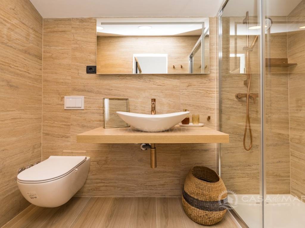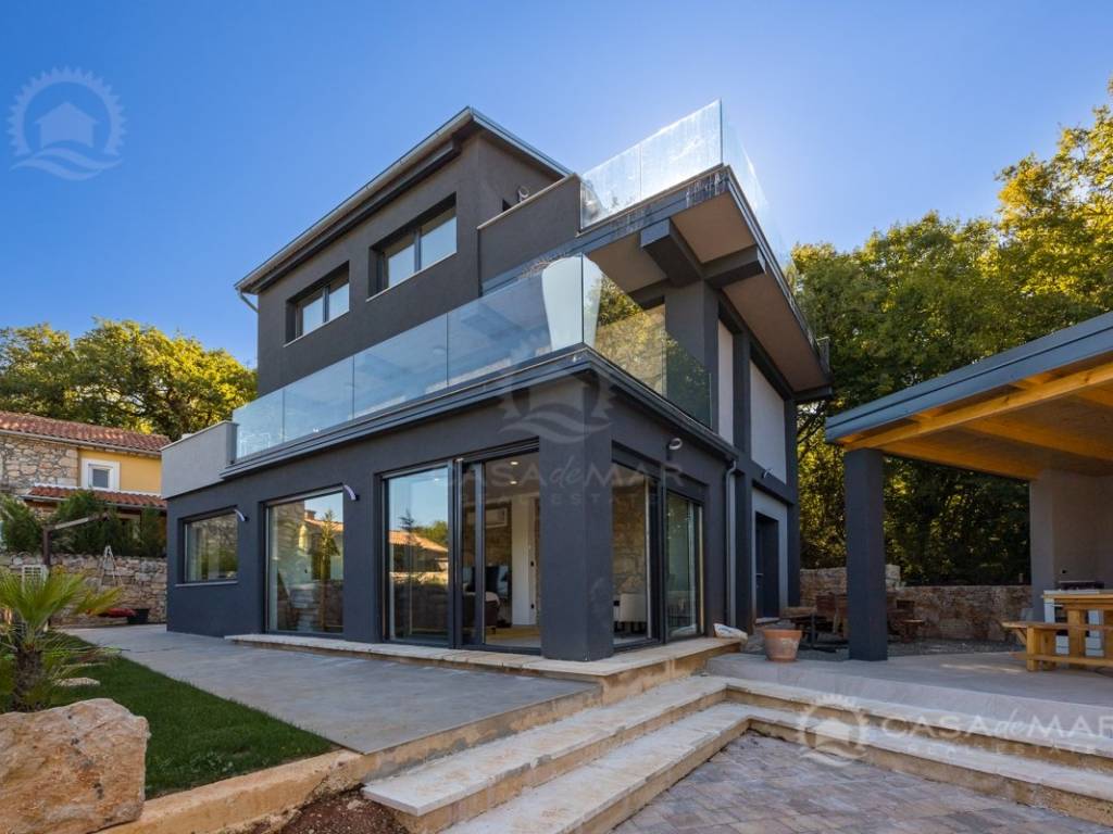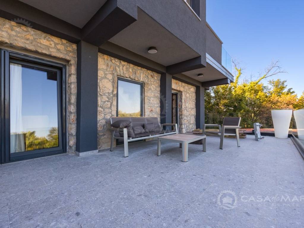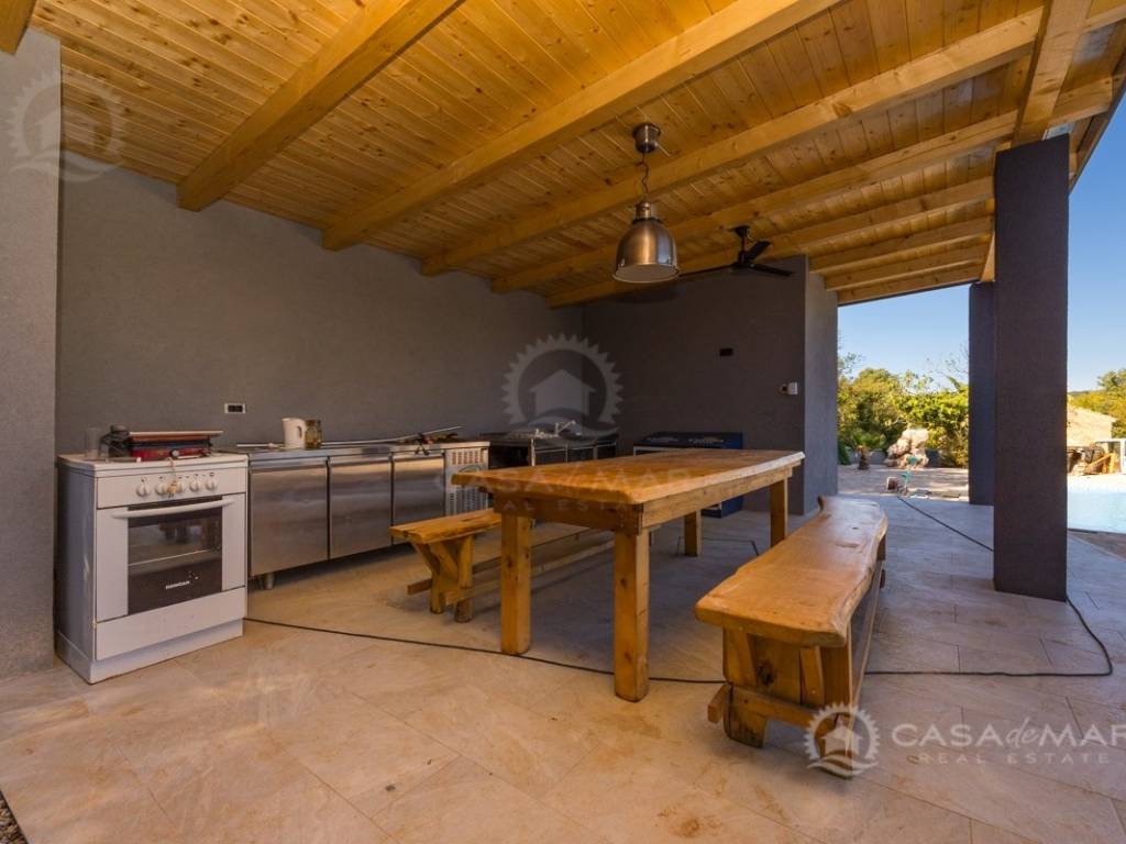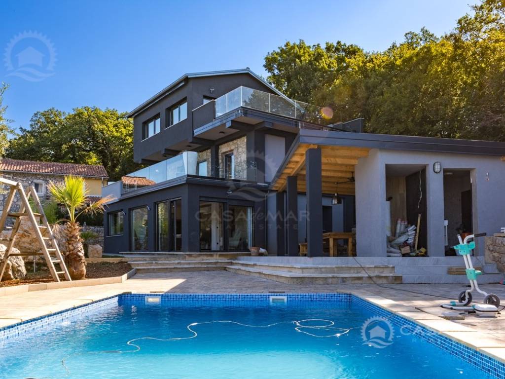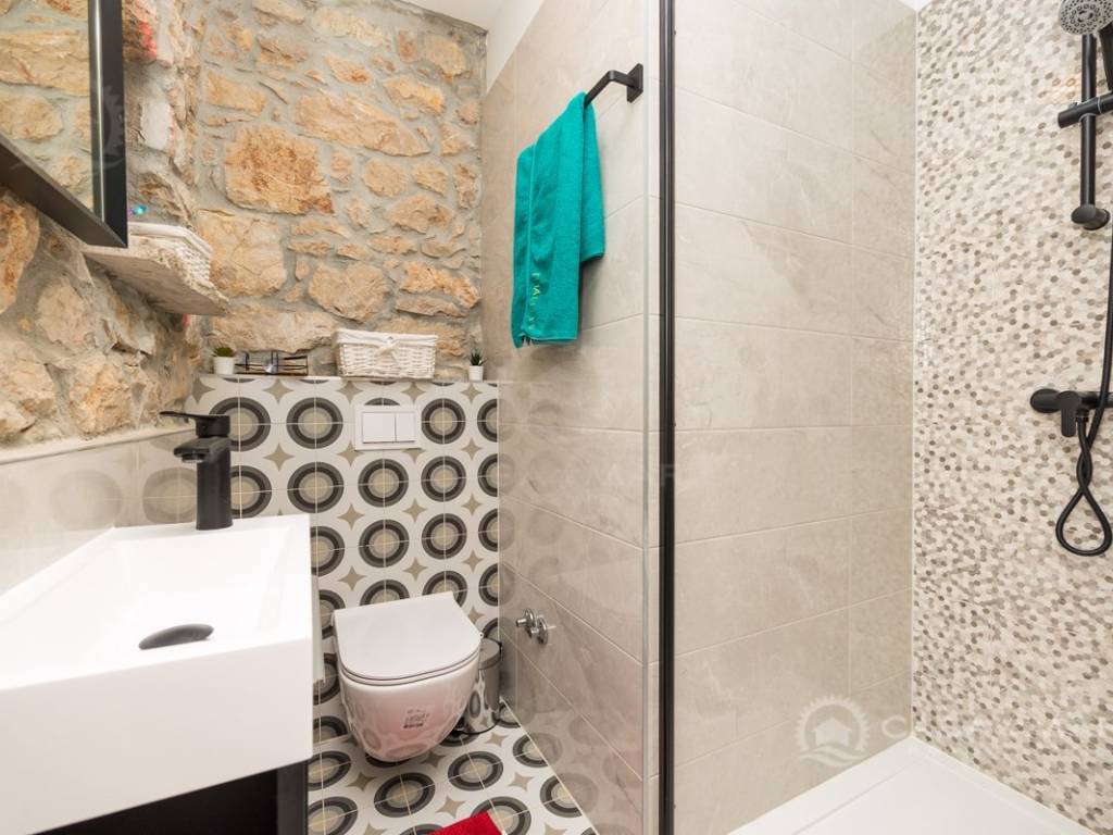 Renovated detached modern stone house with pool The house is currently in the renovation phase, it spreads over 253m2 of living space over three floors connected by internal stairs. The ground floor has a comfortable living room, kitchen with dining area and one toilet. The first floor consists of two bedrooms, two bathrooms and a terrace. On the second floor is another spacious bedroom with bathroom and great terrace. The house has a charmingly landscaped garden with a swimming pool with sun deck and garden barbecue. The building has been renovated with excellent quality materials, PVC joinery with mosquito nets and electric shutters, and high quality ceramics. The living room and bedrooms are air conditioned, and heating is provided via a heat pump via radiators and underfloor heating systems throughout the house. It is located in a quiet location on the edge of the green belt, only five to ten minutes away from beaches, larger places, restaurants and other facilities, which makes this property perfect for personal use but also for rent during the tourist season.