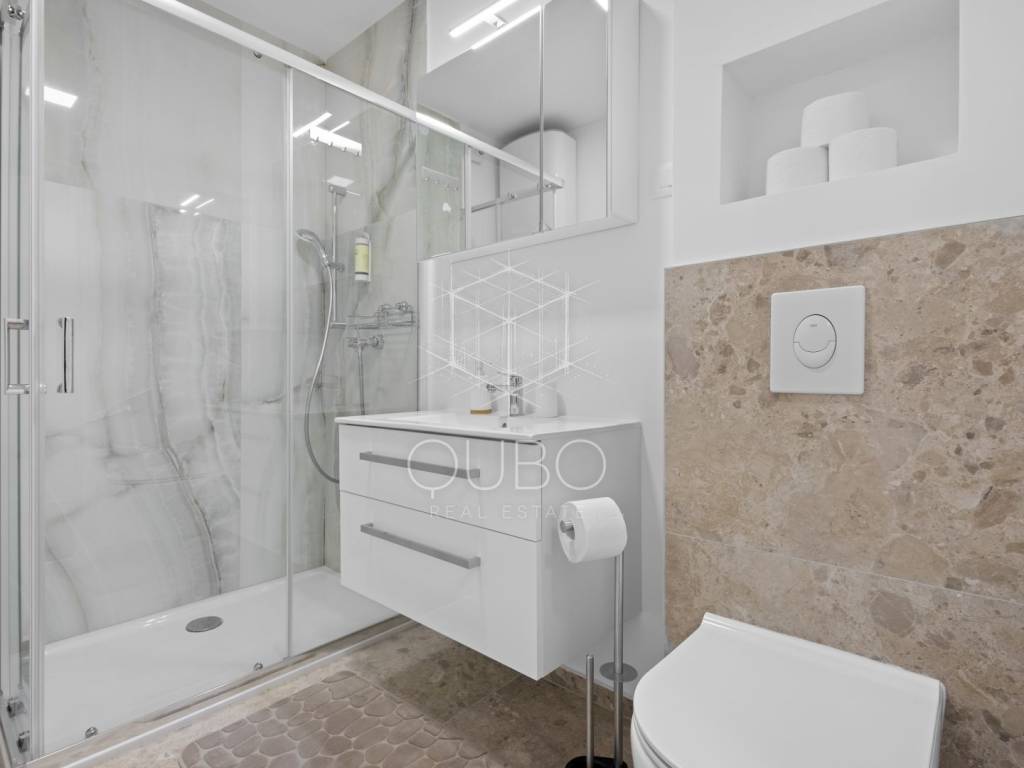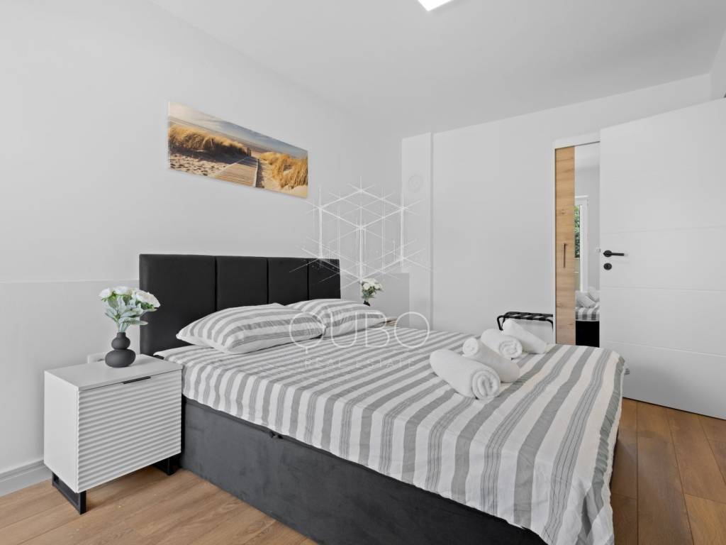 The apartment consists of two bedrooms, a bathroom, a living area connected with the kitchen and dining room, and two terraces ideal for relaxation. It is fully air-conditioned and includes a private parking space.