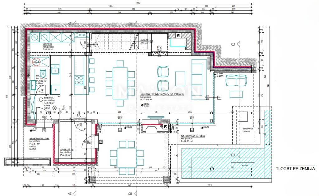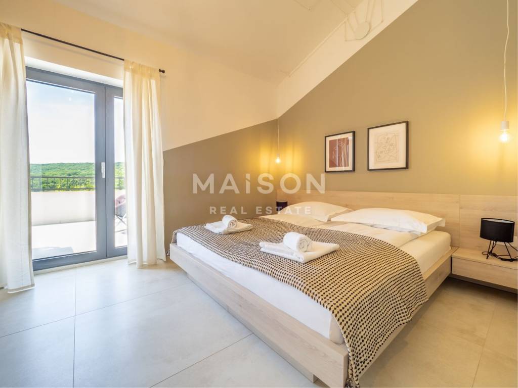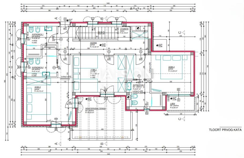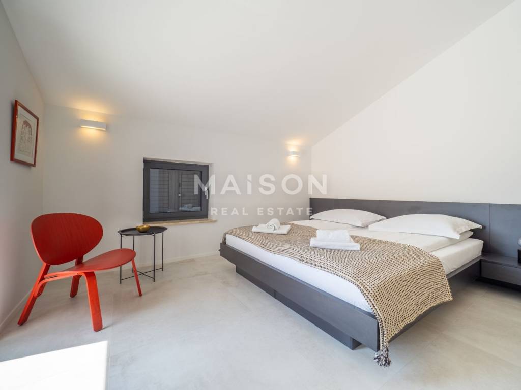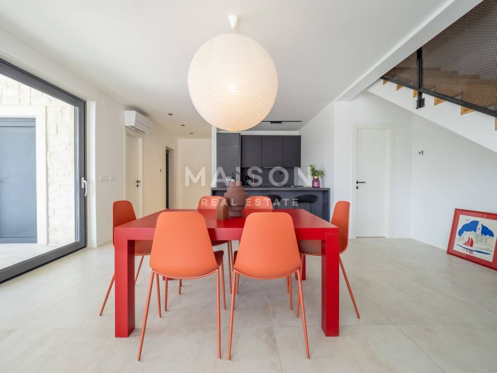 The living area of 160 m² is spread over two floors. The ground floor features a spacious open-plan living area with a kitchen, dining room, and living room with direct access to a terrace and sun deck with a heated pool. There is also a storage room and a guest toilet on this level. The upper floor consists of three comfortable bedrooms, each with its own bathroom, while a covered terrace and loggia offer additional space for relaxation and enjoyment of sea views.