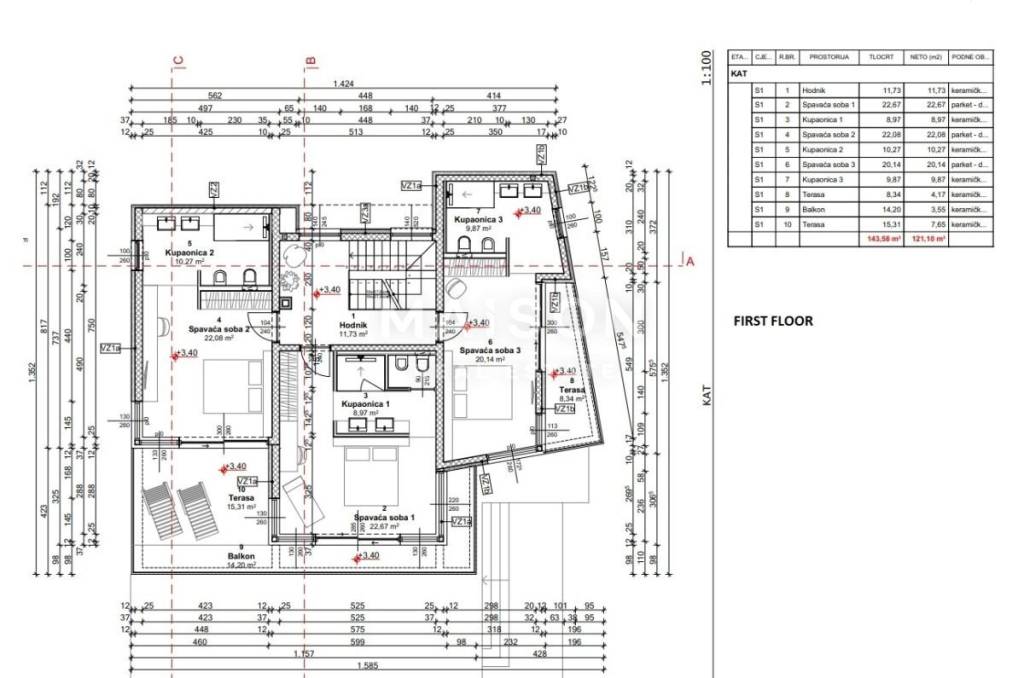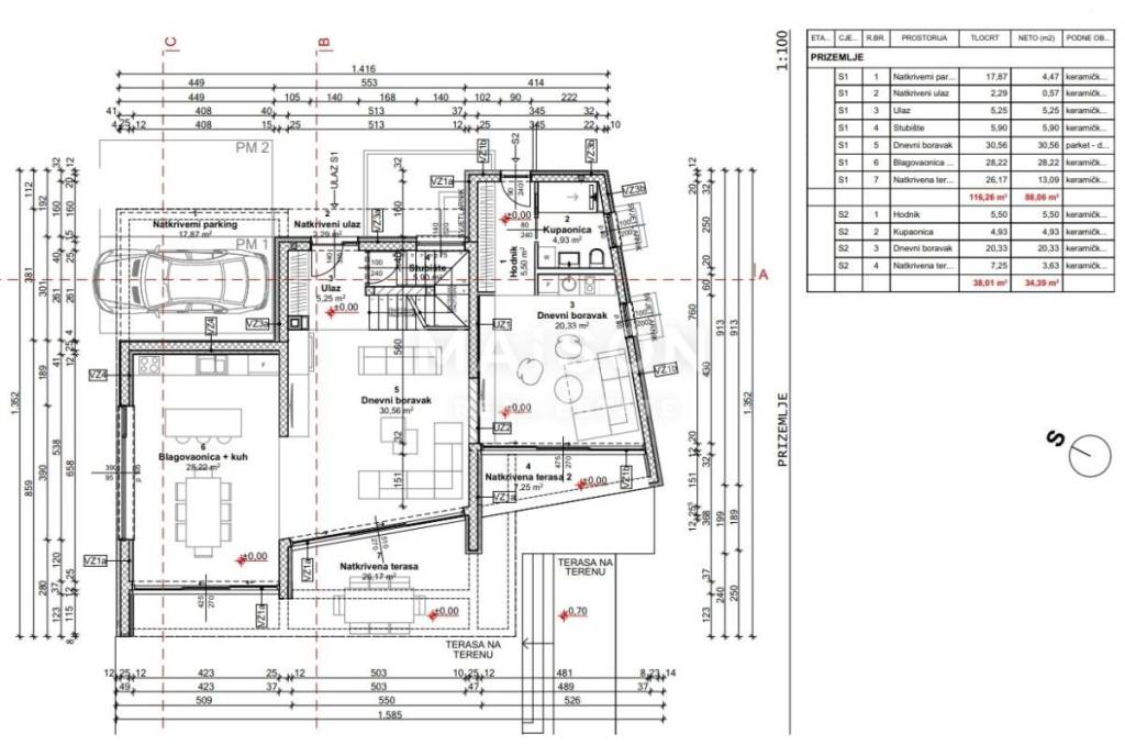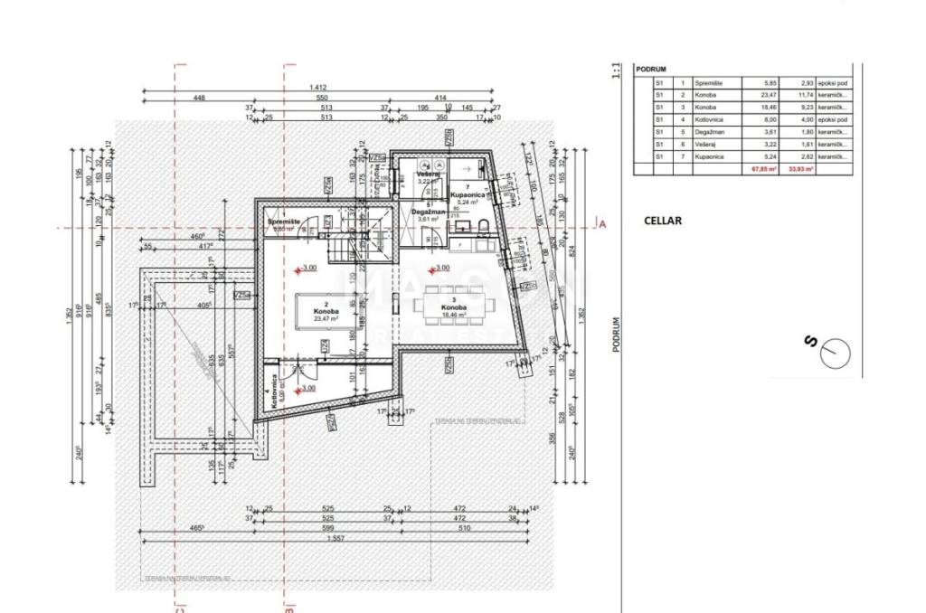 The basement (67.85 m² gross) includes three storage rooms, a boiler room, a laundry, a bathroom, and a hallway. The ground floor (154.27 m² gross) comprises a spacious living room connected to the kitchen and dining area, an internal staircase, and a studio apartment with a covered terrace. The first floor (143.58 m² gross) features three bedrooms, each with its own bathroom, a hallway, a balcony, and two terraces offering a breathtaking view of the sea and Cres – perfect for relaxation and enjoying the sunset. The villa also includes a covered parking space of 18 m² gross.