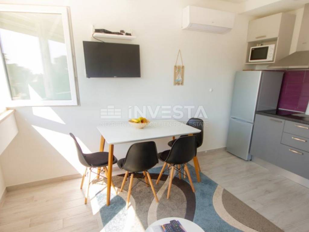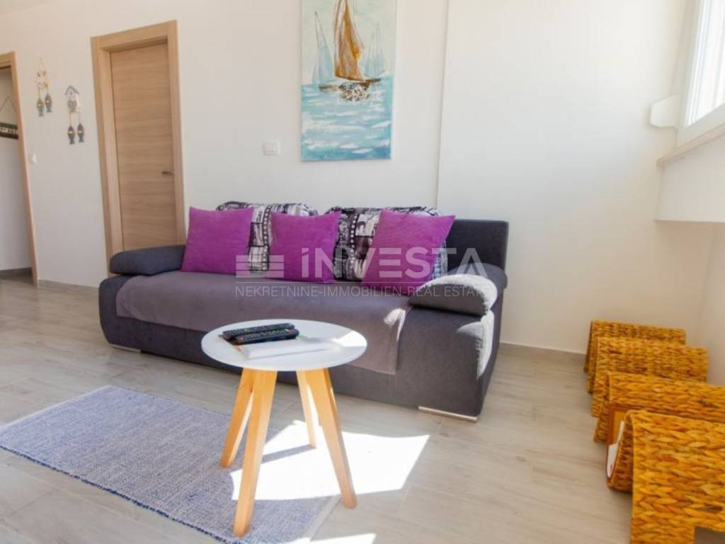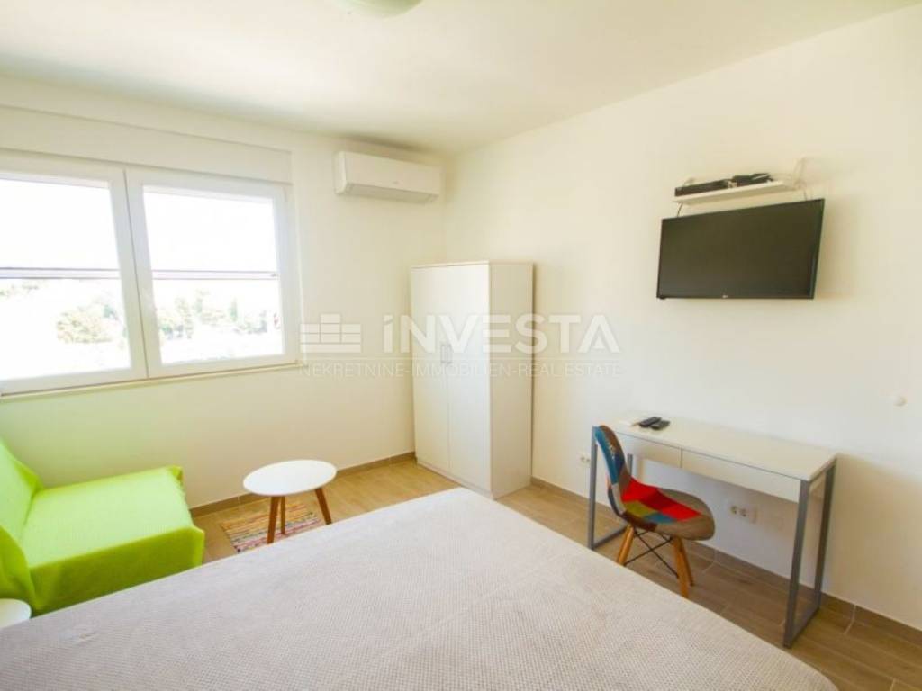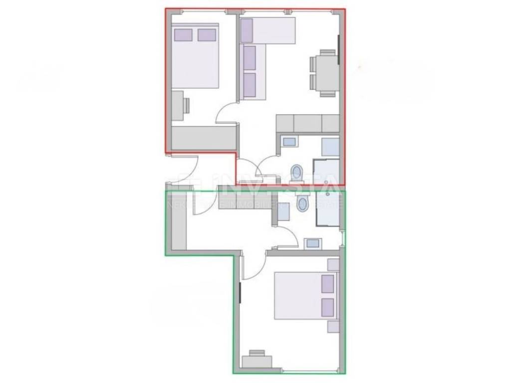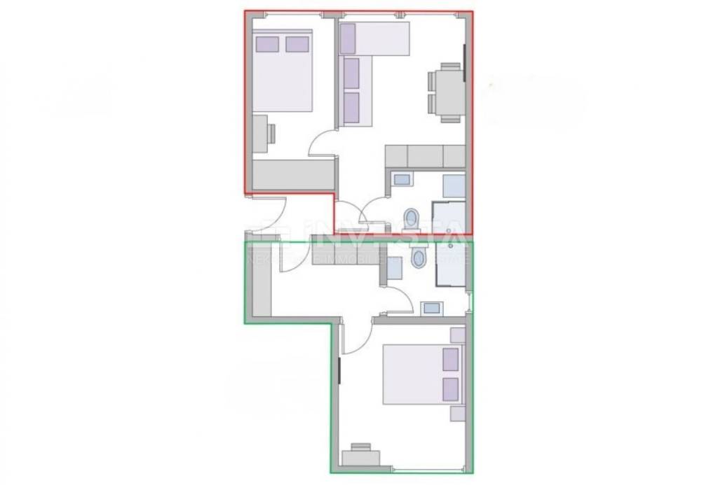 The apartment has a surface area of 61 m² and consists of two identical residential units, each with its own separate entrance. The apartment is located on the 6th floor of a building with a total of 8 floors. The building was constructed in 1970, and the apartments were thoroughly renovated and equipped in 2019. The apartments are equipped with air conditioning units for heating and cooling. The apartment also includes part of the shared basement space, which is not included in the stated area of the apartment. There are plenty of free public parking spaces available near the apartment, ensuring parking at any time of the day. All necessary amenities (shops, market, pharmacy, health center, restaurants, cafes, gym, city pool) are nearby, and the beaches and Lungo Mare are just 900 meters away.