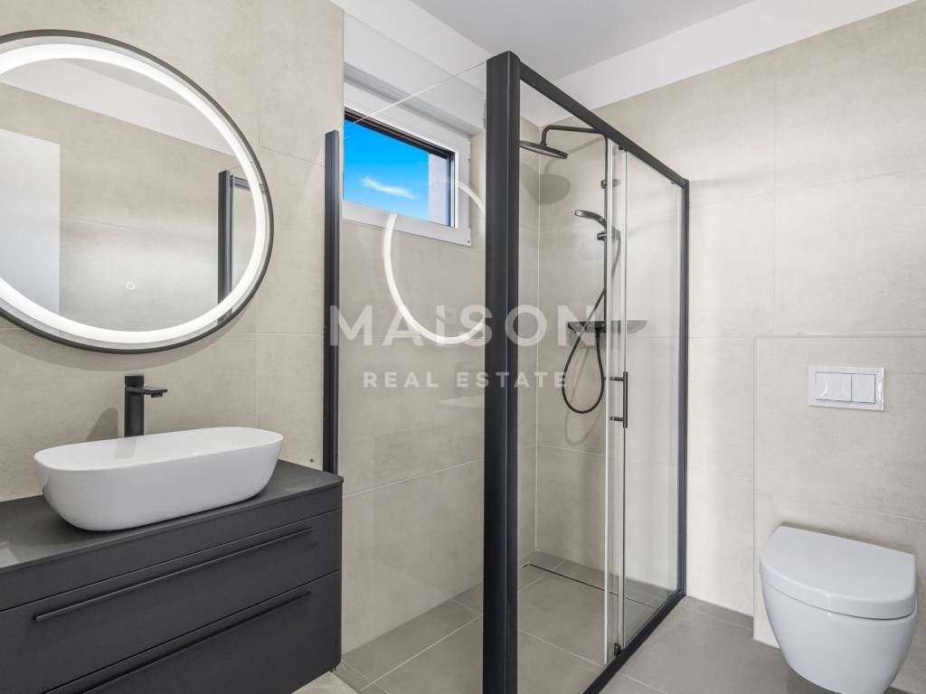 On the ground floor there is a luxurious master bedroom with its own bathroom and dressing room, providing maximum privacy and comfort. The entrance area leads to the hallway with laundry and garage that provides safe and convenient parking. The connection with the outdoor space is emphasized by a spacious terrace that invites you to enjoy nature and fresh sea air.