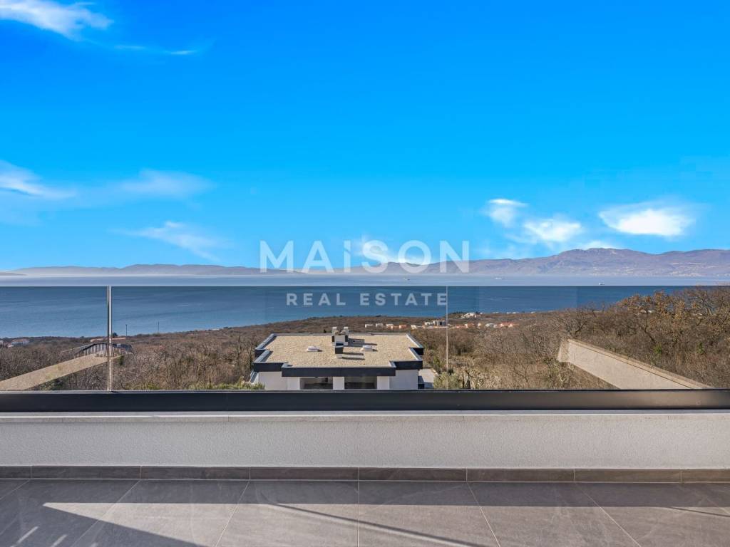The first floor offers two spacious bedrooms with access to the terrace and spectacular views of the Kvarner Bay, along with a modern bathroom that completes this intimate zone of the home.