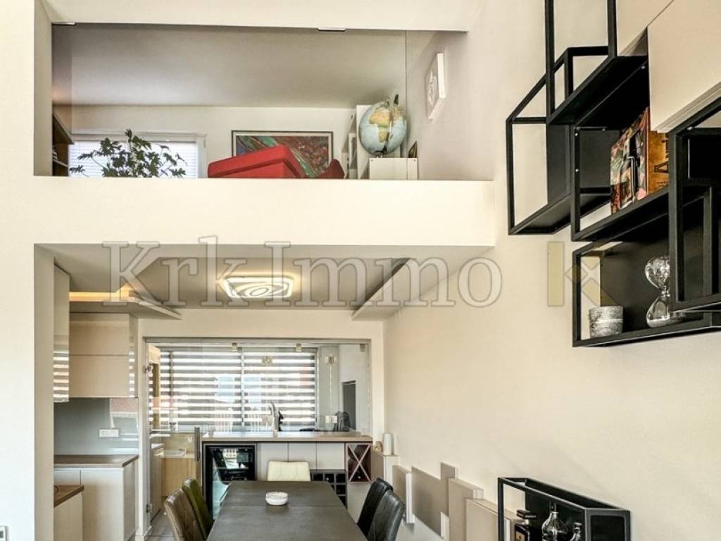 A fully equipped kitchen, dining area, and a cozy living room open onto a covered terrace, ideal for morning coffee or evening sunsets. The internal staircase leads to a gallery where there is a study, a reading corner, and an exercise area – details that make this property on the island of Krk a unique home for everyday living or tourist rental.