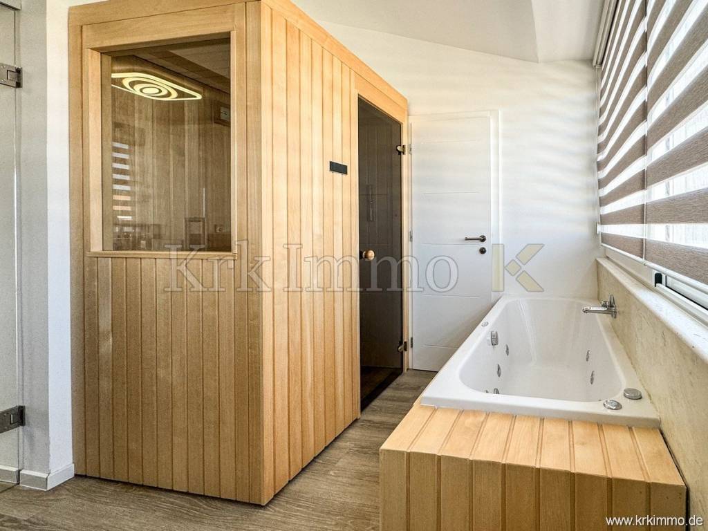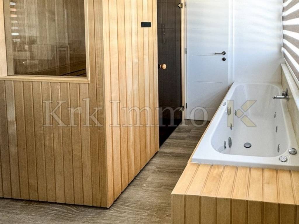 The apartment consists of a spacious hallway, two bedrooms with French balconies that fill the space with natural light, a modern bathroom, and a particularly attractive wellness area with a whirlpool bathtub and sauna – a perfect place to relax after a day spent in the sun and by the sea.