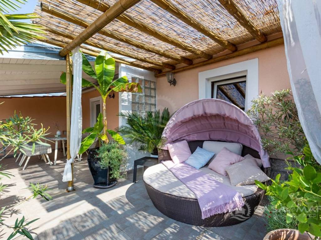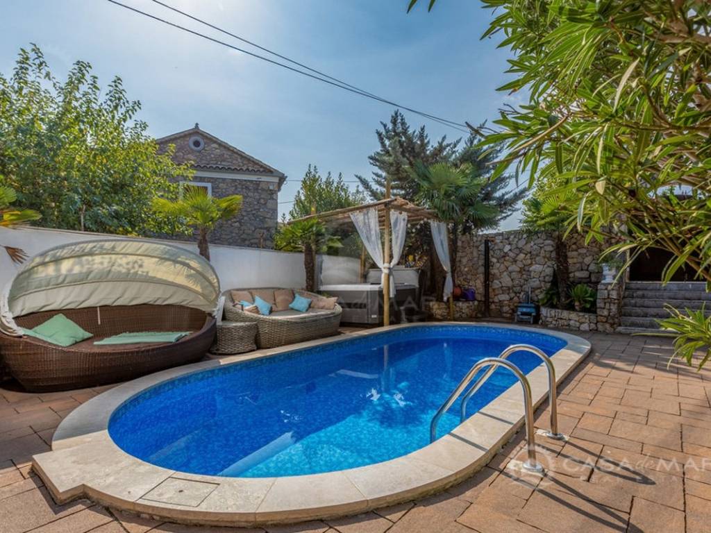 Near Šilo on the island of Krk, a semi-detached house with a total area of 169 m² is for sale, situated on a landscaped plot of 250 m². The house consists of a ground floor and first floor, divided into two fully equipped residential units – ideal for family living or tourist rental. The ground floor apartment consists of a living room, kitchen, dining area, two bedrooms, a bathroom, and a private terrace, while the second apartment, located on the upper floor, includes one bedroom, a kitchen, dining area, and living room, also with a private terrace.