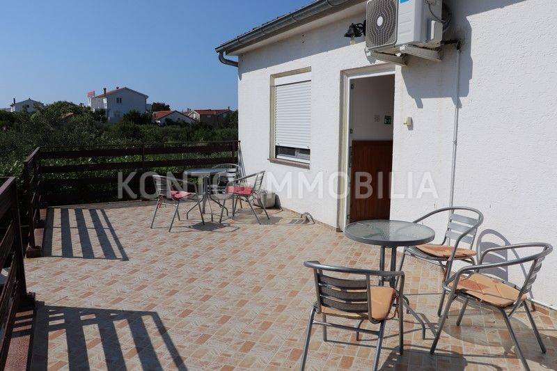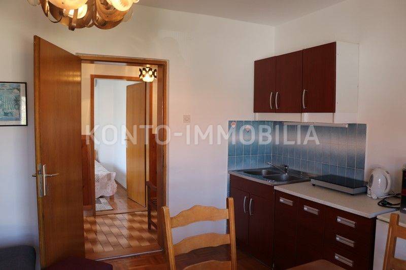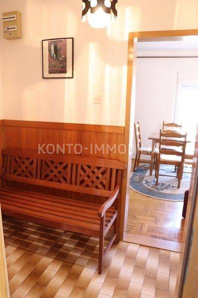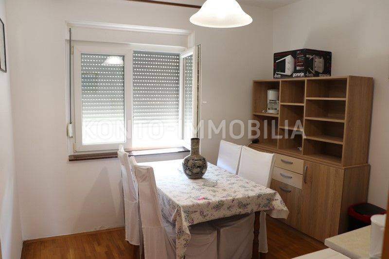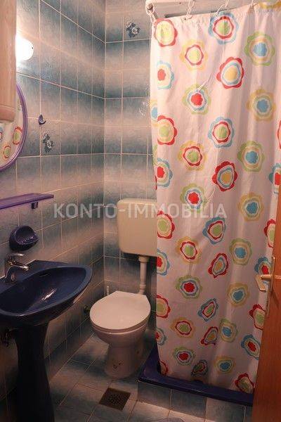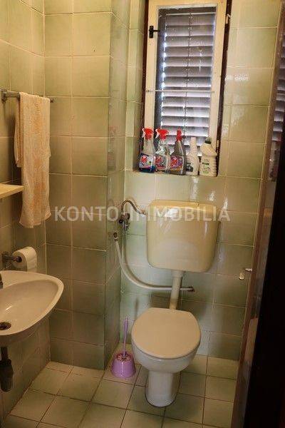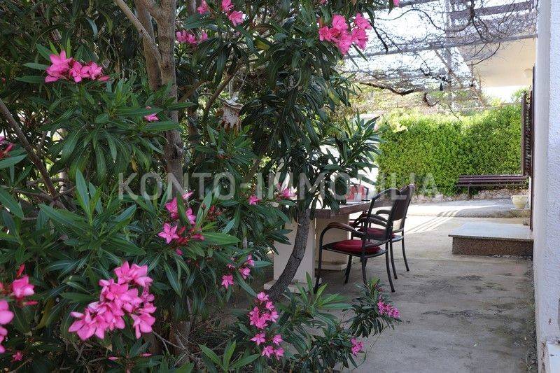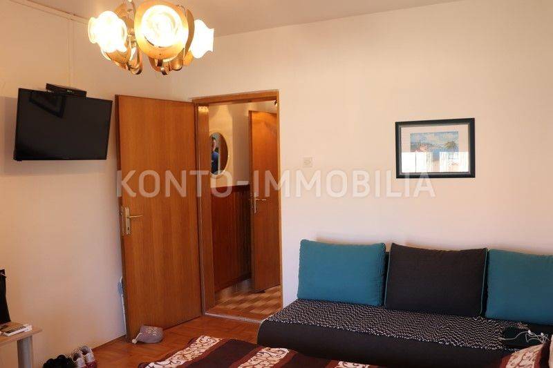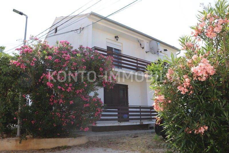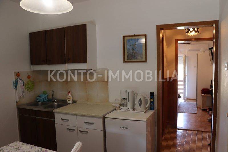 A small family house with three apartments, a garden, in a great location and close to the sea. There is a large three-bedroom apartment on the ground floor, while on the first floor there are two one-bedroom apartments with a spacious common terrace. The house is furnished, and the apartments on the first floor are air-conditioned. There is also a garage on the ground floor, which can also be arranged as a living space. The house is habitable, but it requires additional renovation.