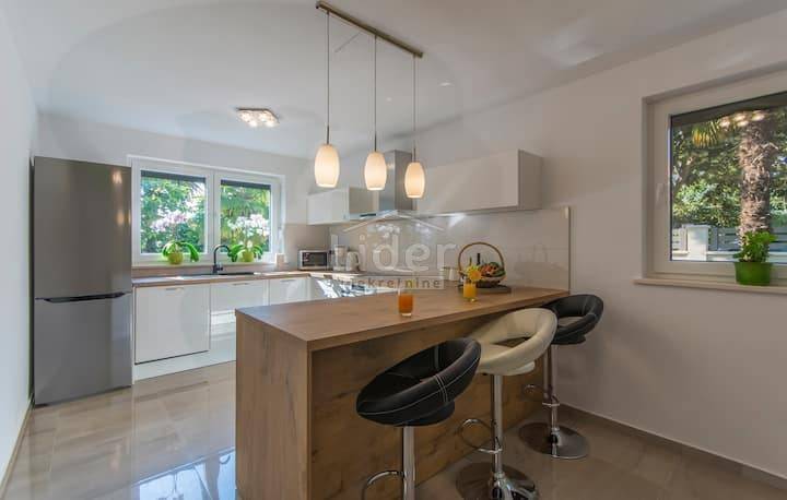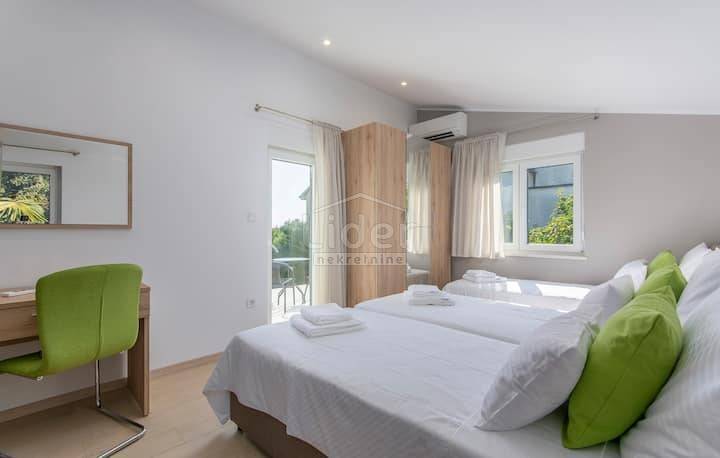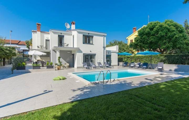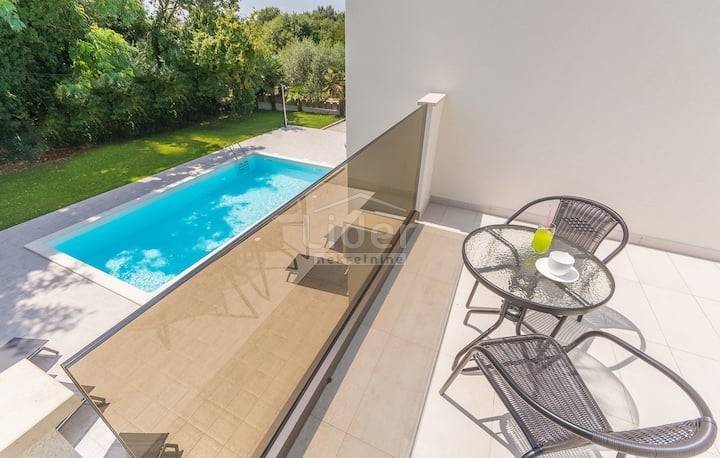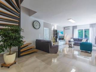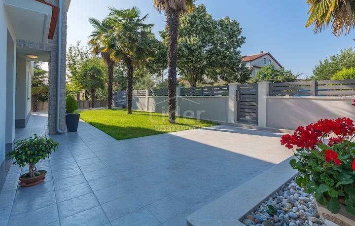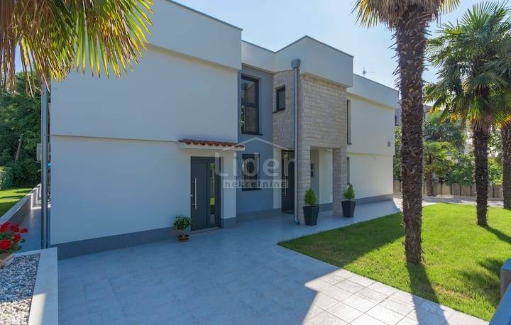 Beautiful villa for sale in Porec, only 300 meters from the famous beaches. Beautifully decorated villa of modern design is located in one of the most popular settlements in the city of Porec. The villa has an area of 230m2 and is located on a plot of 700m2 on which there is a beautiful pool of 32m2. The villa consists of a ground floor and first floor and a small room next to the house that serves as a small room with a kitchen to serve the house. On the ground floor there are: a spacious living room overlooking the outdoor pool through a large glass wall, a modern kitchen and dining room, a children's playroom and a separate entrance to the room intended for housekeeping. In this room there is a bedroom, storage room and kitchen. On the first floor there are four spacious bedrooms and three bathrooms. Each room has its own terrace overlooking the surroundings and a courtyard with a swimming pool on the ground floor. In the yard of the house there is a beautiful fireplace, and it is important to note that the house has an internal electric fireplace that can be replaced with one for wood. Heating in the villa is air conditioned, but the whole ground floor has underfloor heating.