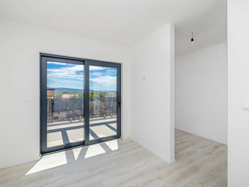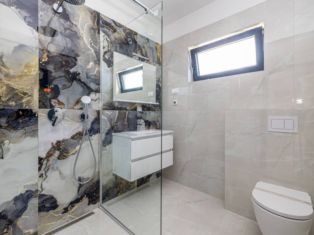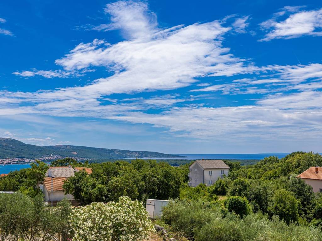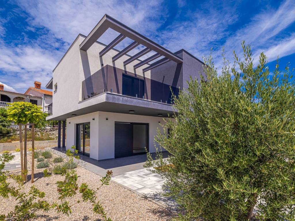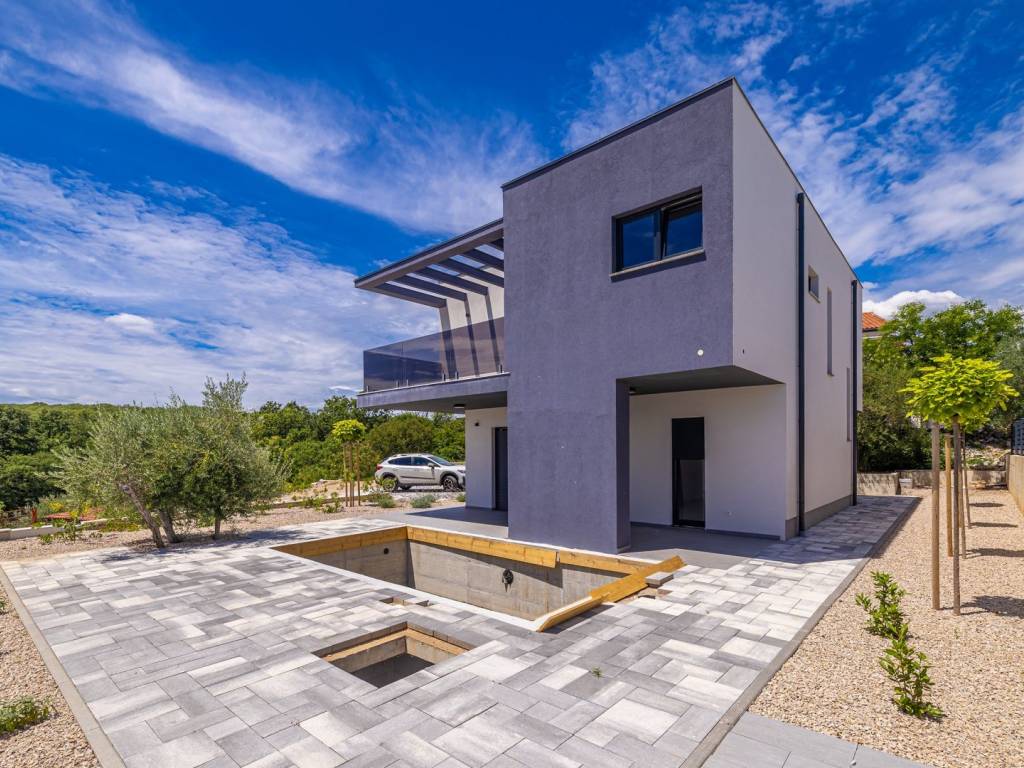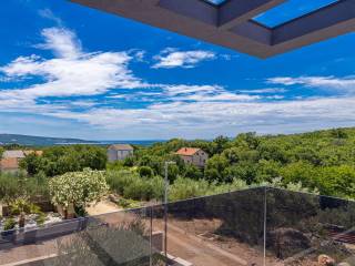 In an exceptionally quiet location, on the edge of a green area in a charming village on the ISLAND OF KRK, is this modern luxury villa with a swimming pool and panoramic sea views. Perfectly integrated into the natural environment, this property offers the ideal combination of comfort, elegance and privacy. The ground floor is designed as an open concept of daily life - a spacious kitchen with a dining area and an elegant living room with a fireplace opens onto a covered terrace and a carefully landscaped garden with a swimming pool and a sunbathing area. There is also a bathroom and a storage room with a central boiler, which further emphasizes functionality. Upstairs there are three airy bedrooms, each with its own bathroom, two of which have access to a terrace. The master bedroom with a private south-facing terrace and a mesmerizing sea view provides a special exclusivity. The villa is equipped with electric underfloor heating on the ground floor and in all bathrooms, which guarantees year-round comfort. Two private parking spaces are also available. This elegant property is ideal for anyone looking for peace, luxury and proximity to the sea on one of the most desirable islands in the Adriatic.