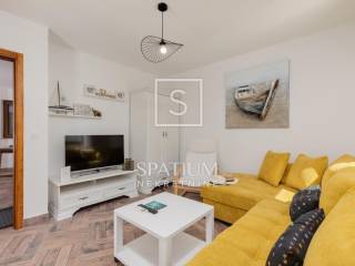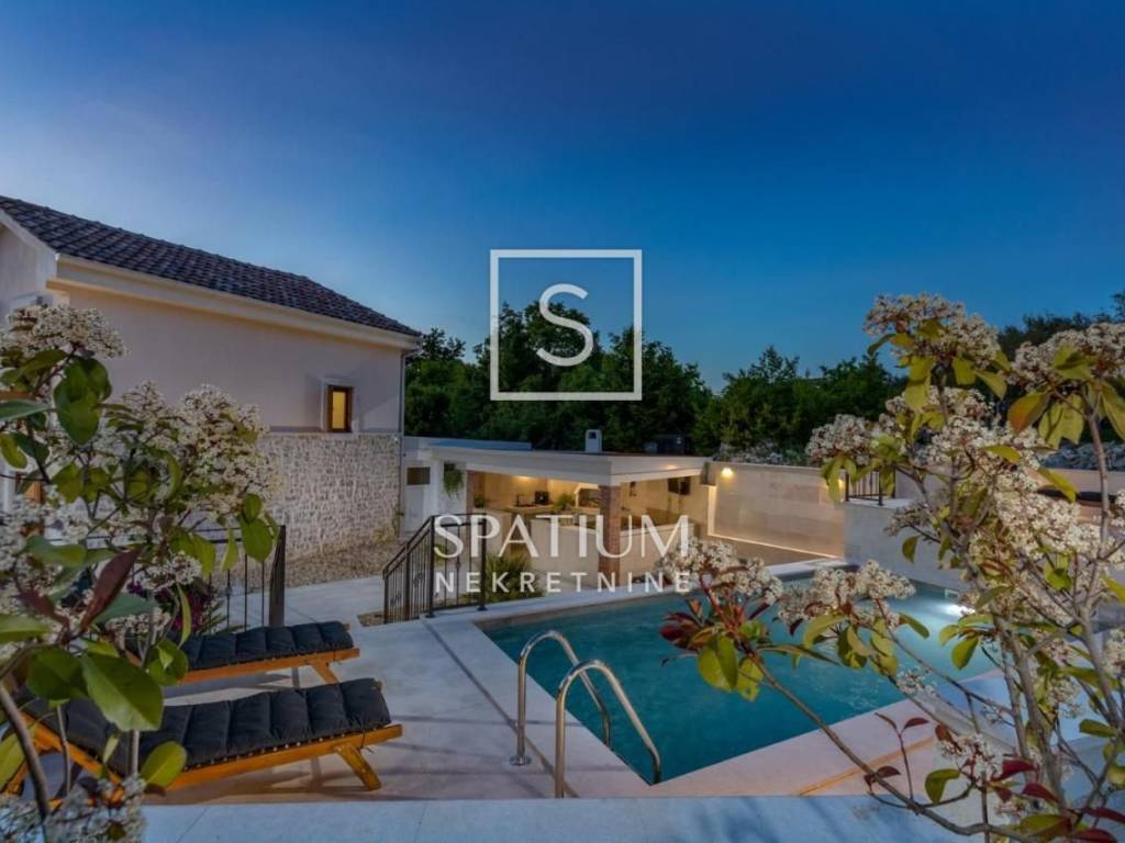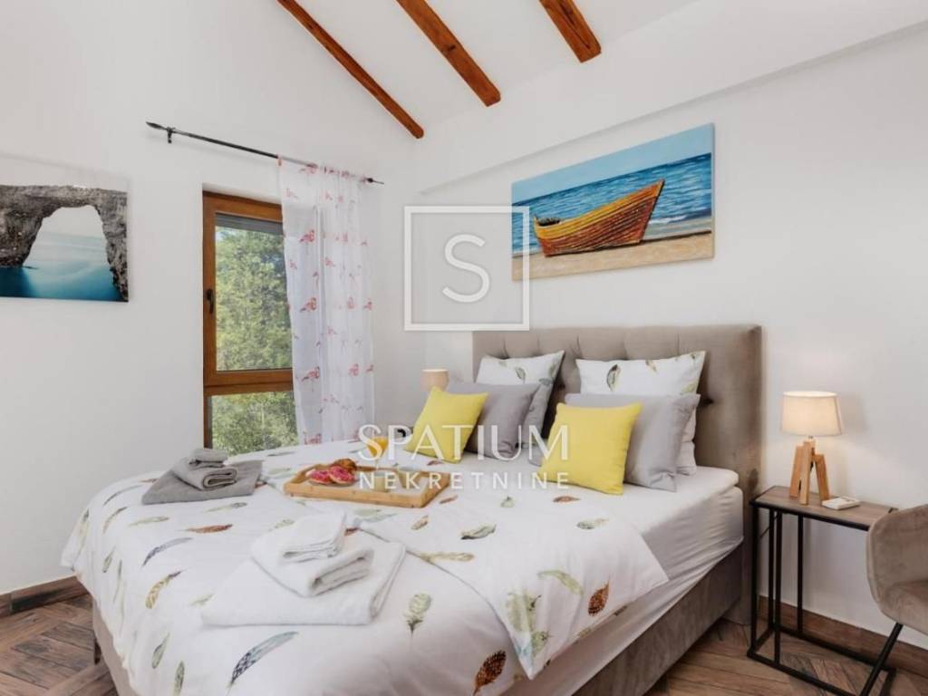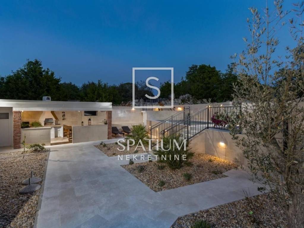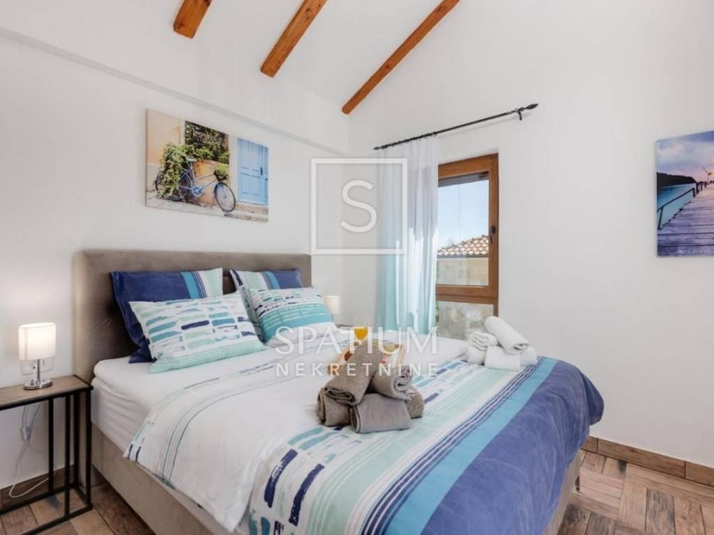 LJUTIĆI, MALINSKA, offers a newly renovated, detached house with a swimming pool. Living area of 130 m2 and fenced garden area of 440 m2. It consists of a ground floor and a first floor interconnected by an internal staircase. Ground floor: kitchen with dining room, living room and bathroom. Floor: two bedrooms with balconies and two bathrooms. Inside the beautifully decorated and fenced yard there are two storage rooms, a covered terrace, a summer kitchen with a barbecue, a heated swimming pool with salt water. In a quiet area, the house was built in 2020, fully furnished, air-conditioned and ready for use.