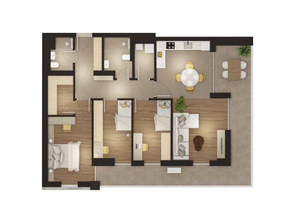 Apartment 1.3 is located on the third floor of the building, and with its functional layout and spacious loggia, it provides an exceptionally pleasant environment for everyday family life. The hallway leads to the sleeping area of the apartment, where there are three bedrooms, and an additional wardrobe and storage room make it easier to organize the space. Two bathrooms provide comfort for a larger household. The living area consists of a modern kitchen connected to the dining room and living room, which opens onto a spacious loggia, ideal for spending time outdoors. The apartment comes with two garage spaces and a storage room in the basement. The project consists of 40 apartments spread over five above-ground floors and four business spaces on the ground floor. The building is fully completed, the apartments are condominiums, and purchase is possible with a loan. Each apartment has a storage room in the basement and at least one garage space. The project includes a total of 75 garage spaces. The location in Zamet offers proximity to schools, kindergartens, markets, beaches, shops and sports facilities, and you are only about a fifteen-minute drive from the center of Rijeka or Opatija. The apartments have a modern design, with attached loggias, terraces or gardens, adapted to the modern lifestyle.