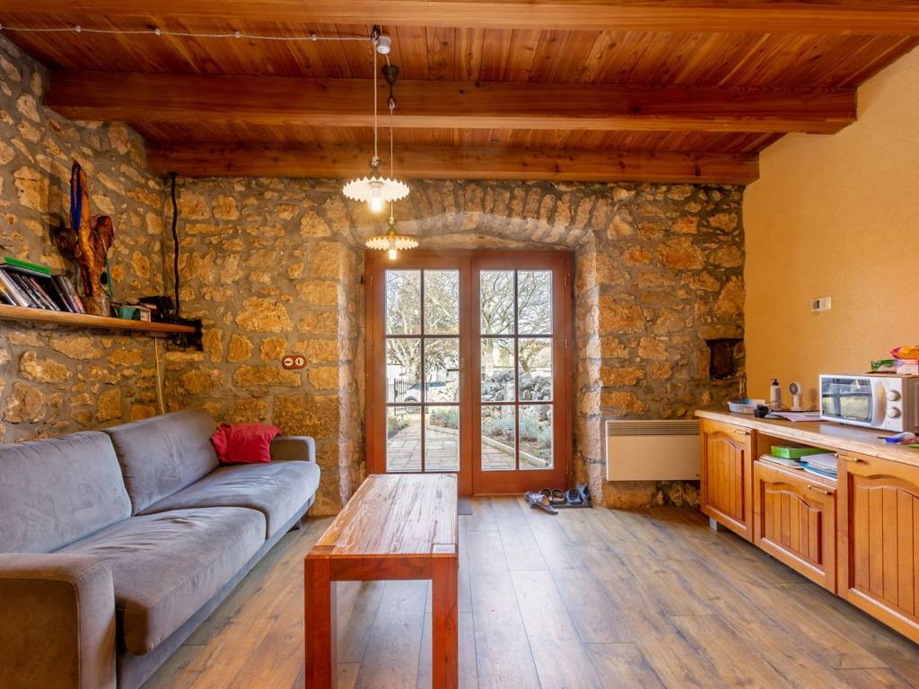 In the heart of the Island of Krk, in the peaceful surroundings of Malinska, is this beautifully renovated authentic stone house that exudes Mediterranean charm and tradition. This exceptional property underwent a complete renovation down to the smallest detail in 2020, while maintaining the original Krk spirit. It is located in a quiet location, without traffic, and is only 2 kilometers from the sea, to which it is connected by picturesque cycling and hiking trails. The house is spread over two floors, with a total of 120 m² of living space on a carefully landscaped plot of 456 m². At the entrance to the property, there is a charming studio apartment with a covered porch, ideal for guests or as an additional source of income. The studio is functionally connected to the authentic stone tavern, which currently serves as a woodshed. The main part of the house begins with a traditional entrance that leads you directly into a cozy open concept kitchen and living room. The first bedroom and an elegantly decorated bathroom are also located on this floor. An internal staircase leads to the upper floor where there is an exceptionally spacious room with great potential. This room offers unparalleled flexibility and, with minimal intervention, can easily be reconfigured and divided into two comfortable bedrooms, thus increasing the accommodation capacity and value of the property. The installation for a second bathroom is also prepared on the upper floor, thus optimizing the functionality of the upper floor. From this level, there is access to a spacious upper terrace with an unforgettable view of the sea. The house is decorated with exceptional taste, furnished and full of indigenous details that create a warm and cozy atmosphere. Heating is provided by a cozy fireplace in the living room and electric radiators, while the wooden exterior joinery contributes to the traditional look. The floor coverings combine vinyl and quality ceramics. The courtyard is a true Mediterranean oasis, planted with indigenous plants and olive trees, with a built-in irrigation system, which ensures freshness and lush greenery, especially in spring and summer. This renovated stone house is the perfect blend of peaceful island life, traditional architecture and modern comfort. Don't miss your chance to own this Adriatic gem. Contact us today to arrange a viewing and experience the unique charm of this property!