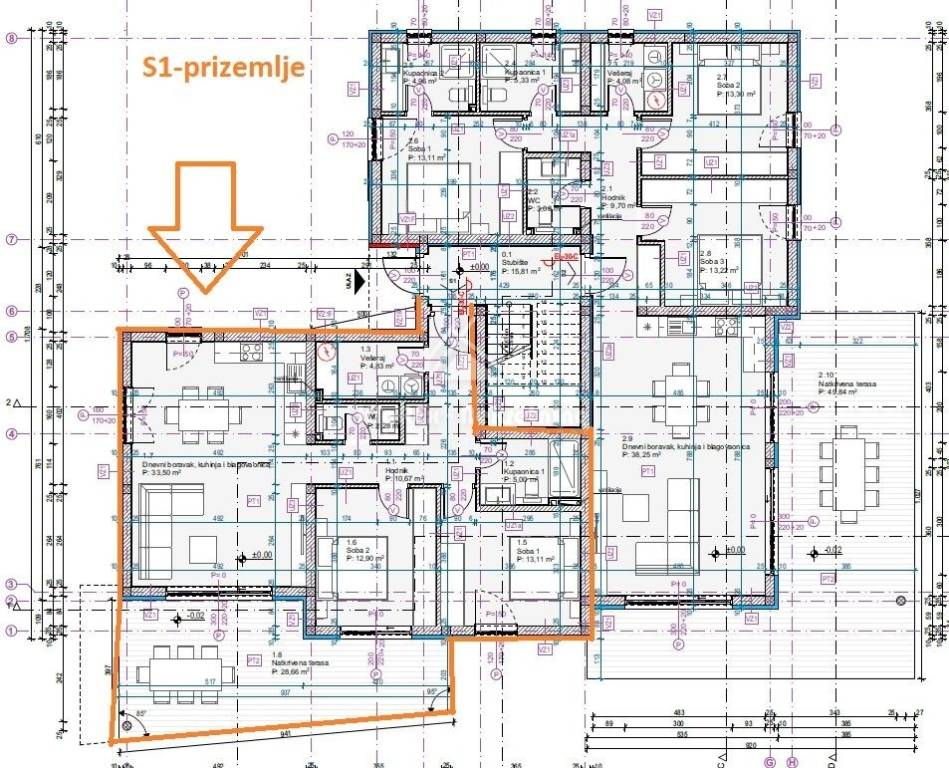 Apartment S1 - a two-bedroom apartment on the ground floor of a residential building with a net area of 113 m/2. The apartment consists of an entrance hall, two bedrooms, a bathroom, a laundry room, a toilet and a large living room with access to a covered terrace of 28.66 m/2. The apartment also has a garden of 120 m/2 and one parking space.