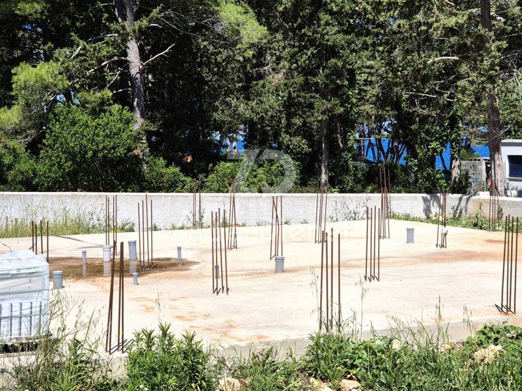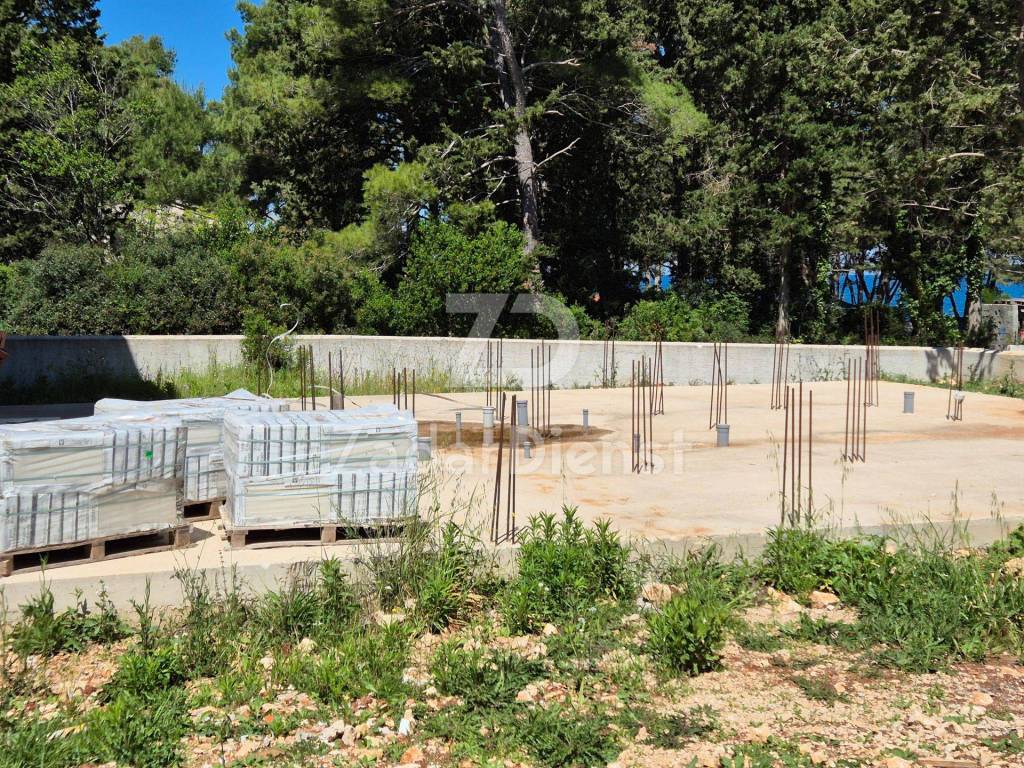 Na zemljištu koje je ograđeno kamenim zidom su izgrađeni temelji za izgradnju stambene zgrade čiji je raspored prema građevinskom projektu slijedeći;