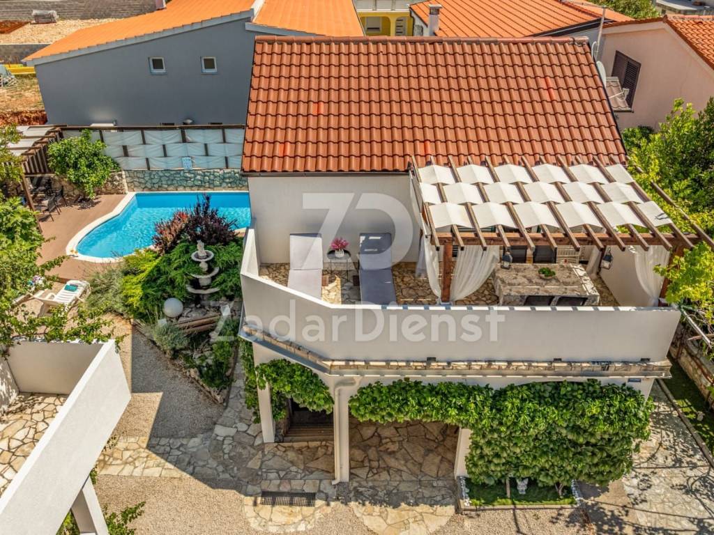 This comfortable house with an outdoor pool is located on the sunny island of Vir. It consists of 2 residential units connected by an external staircase. Behind the house, next to the pool for real refreshment in the summer, there are also deck chairs for additional relaxation, as well as a barbecue where you can prepare delicious meals.