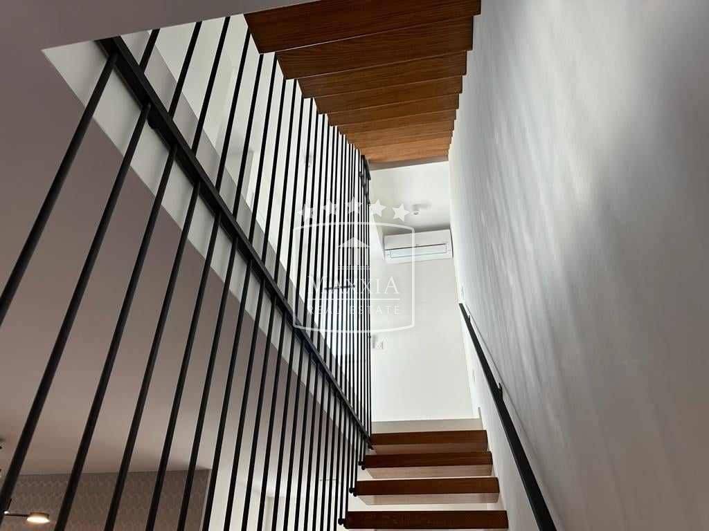 The apartment consists of 2 floors and a large roof terrace. First floor: - kitchen with dining room and living room (open-space concept), - bedroom, - guest toilet, - loggia.
