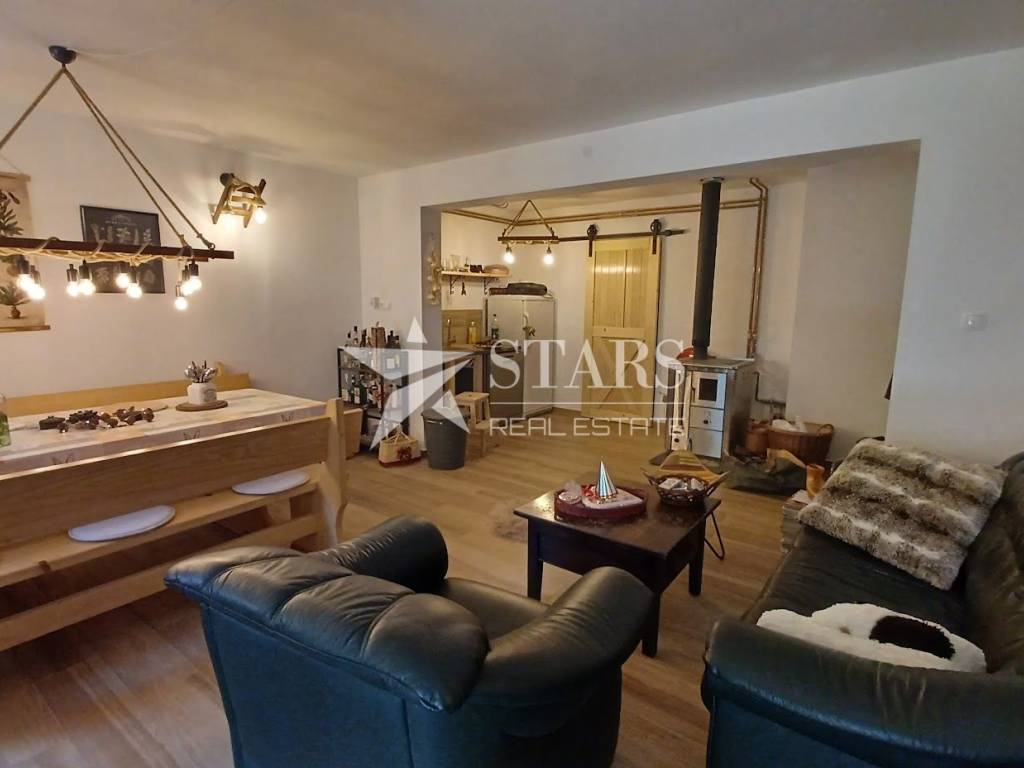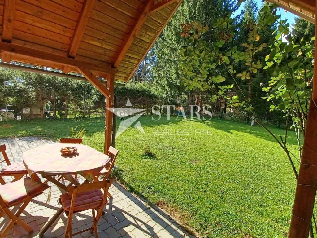 The house consists of a ground floor, upper floor, and a high attic, with a floor plan of 86 m². Every square meter inside the house has been cleverly utilized. On the ground floor, there is a tavern for socializing and relaxation, a small functional kitchen, two storage rooms, and a wood-burning stove for central heating. An internal staircase provides access to the upper floor. The upper floor has a separate external entrance and a covered terrace on the south side of the house to enjoy the view of the forest and greenery. It includes a living and dining area, a kitchen with an additional fireplace not connected to the central heating, creating a true mountain atmosphere with the crackling fire. On this floor, there are two bedrooms, a bathroom, a spacious hallway, and a small room that serves as a wardrobe.
